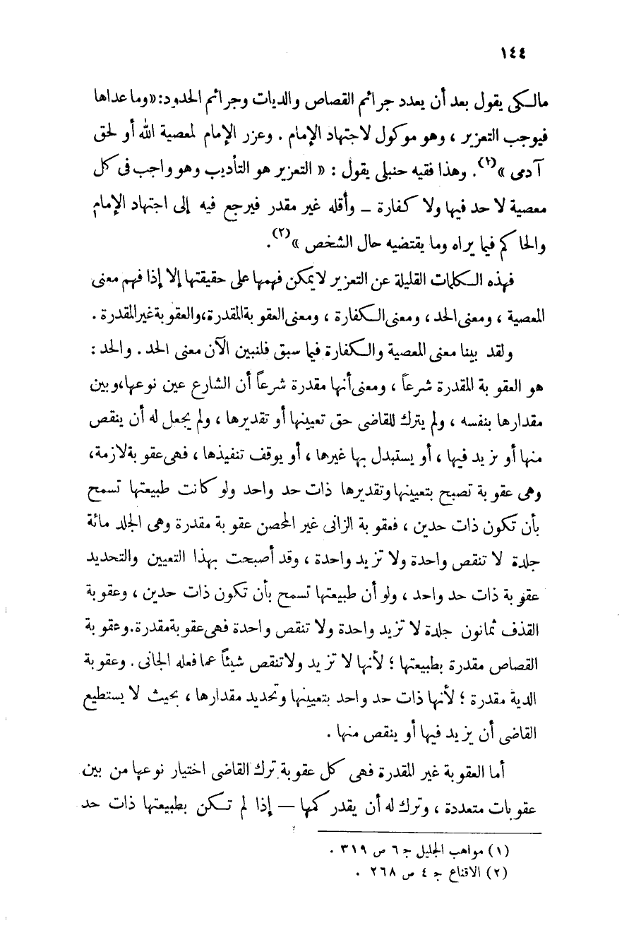وهذا فقيه حنبلي يقول: "التعزير هو التأديب وهو واجب في كل معصية لا حد فيها ولا كفارة، وأقله غير مقدر فيرجع فيه إلى اجتهاد الإمام والحاكم فيما يراه وما يقتضيه حال الشخص" (¬2) .