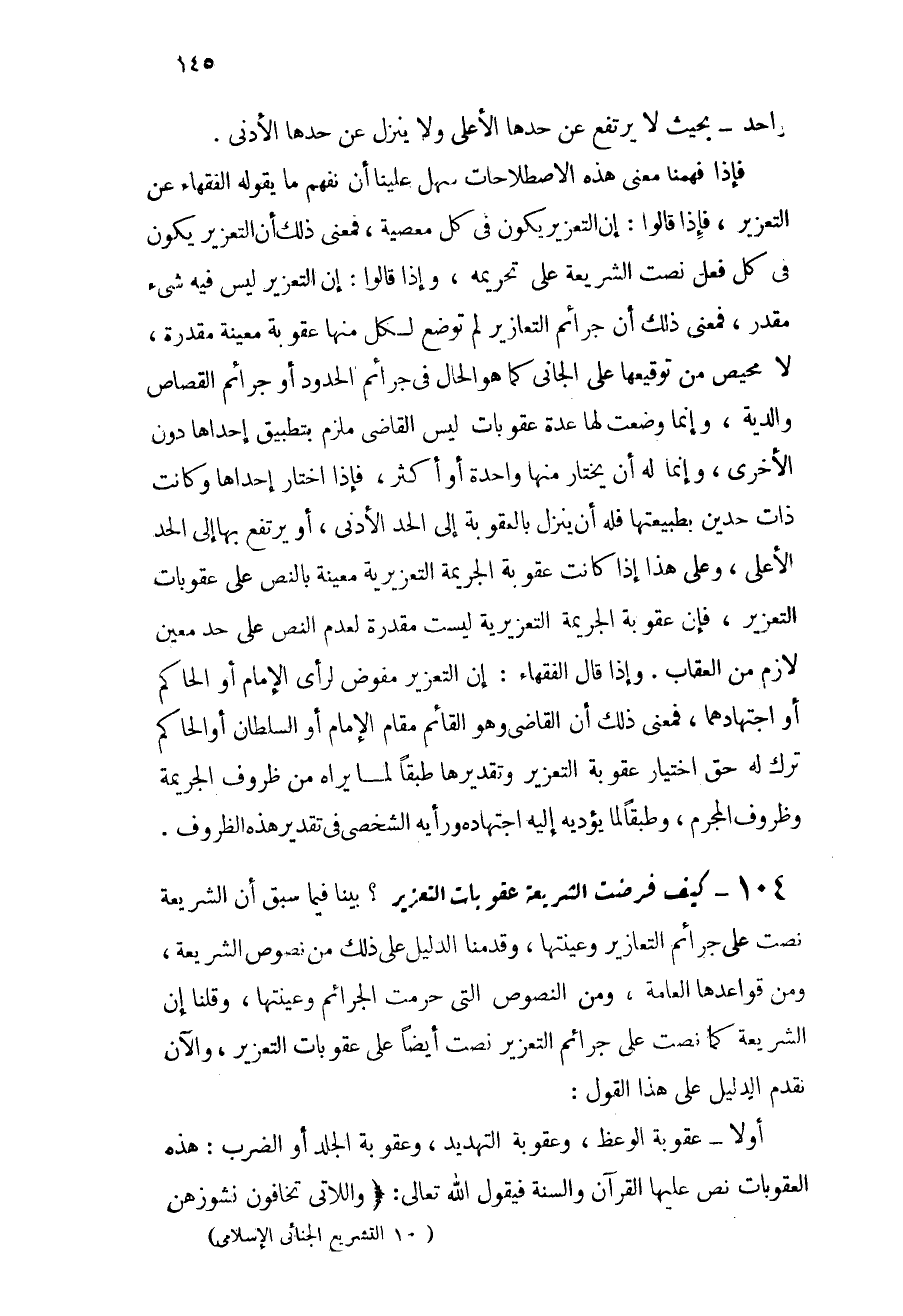 104 - كيف فرضت الشريعة عقوبات التعزير؟: بينا فيما سبق أن الشريعة نصت على جرائم التعازير وعينتها، وقدمنا الدليل على ذلك من نصوص الشريعة، ومن قواعدها العامة، ومن النصوص التي حرمت الجرائم وعينتها، وقلنا إن الشريعة كما نصت على جرائم التعزير نصت أيضاً على عقوبات التعزير، والآن نقدم الدليل على هذا القول: