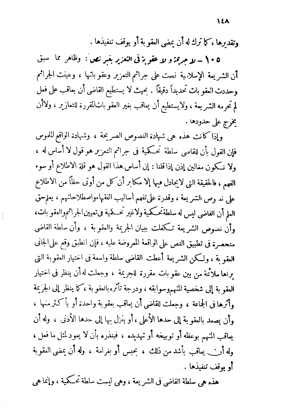 105 - لا جريمة ولا عقوبة في التعزير بغير نص: وظاهر مما سبق أن الشريعة الإسلامية نصت على جرائم التعزير وعقوباتها، وعينت الجرائم وحددت العقوبات تحديداً دقيقاً بحيث لا يستطيع القاضي أن يعاقب على فعل لم تحرمه الشريعة، ولا يستطيع أن يعاقب بغير العقوبات المقررة للتعازير، ولا أن يخرج على حدودها.