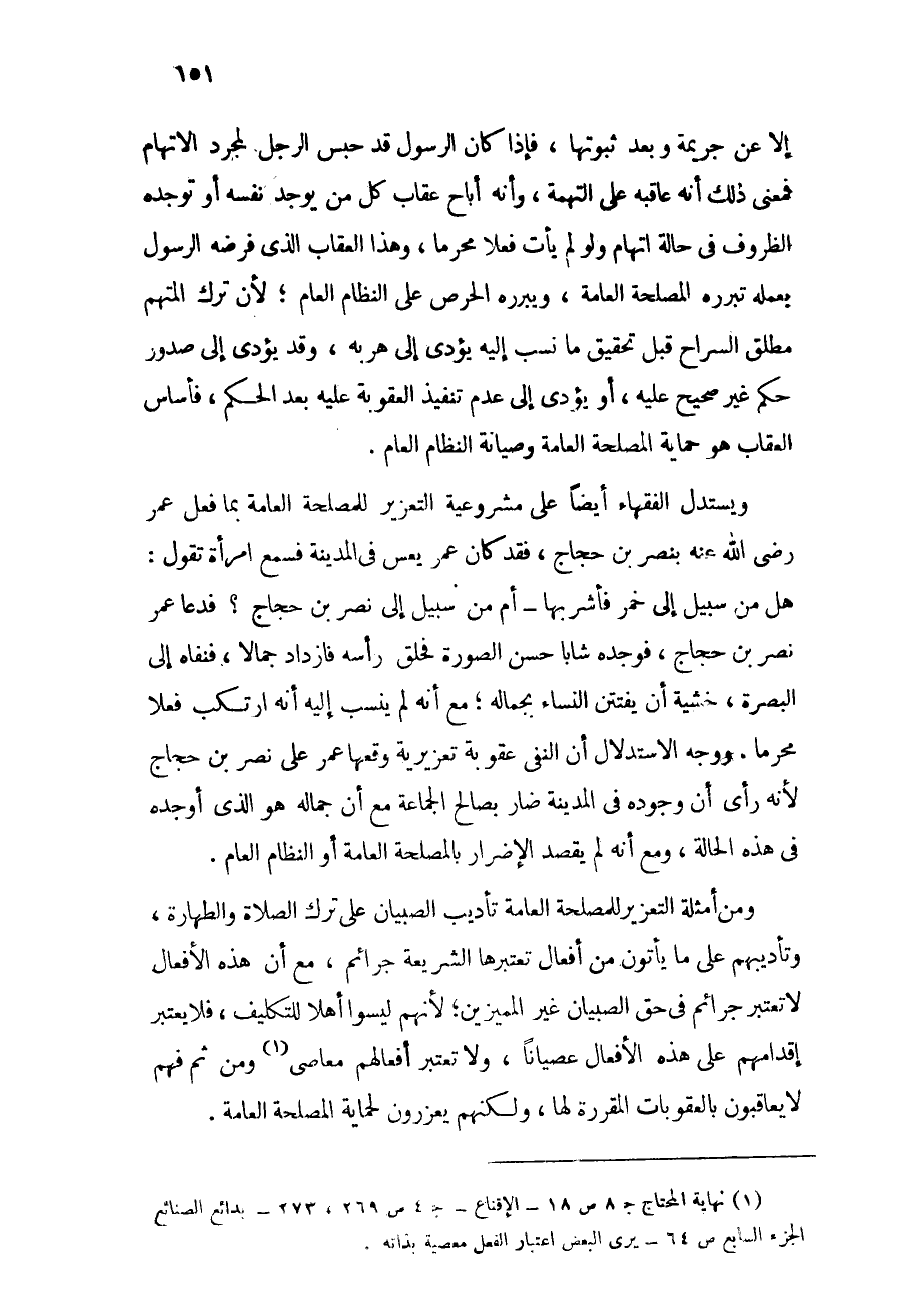 فدعا عمر نصر بن حجاج، فوجده شاباً حسن الصورة فحلق رأسه فازداد جمالاً، فنفاه إلى البصرة، خشية أن تفتتن النساء بجماله، مع أنه لم ينسب إليه أنه ارتكب فعلاً محرماً. ووجه الاستدلال أن النفي عقوبة تعزيرية وقعها عمر على نصر بن حجاج لأنه رأى أن وجوده في المدينة ضار بصالح الجماعة مع أن جماله هو الذي أوجده في هذه الحالة، ومع أنه لم يقصد الإضرار بالمصلحة العامة أو النظام العام.