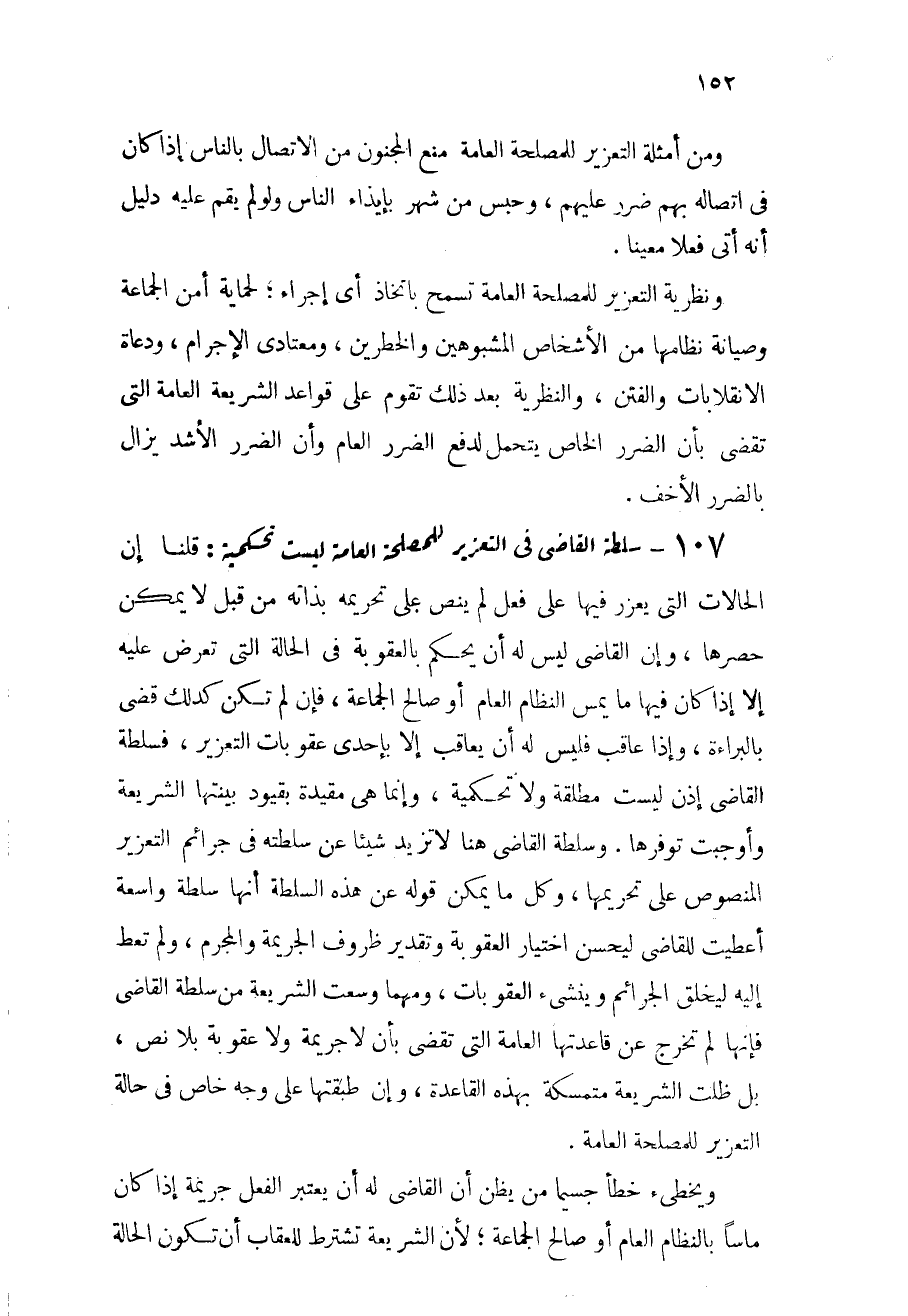 107 - سلطة القاضي في التعزير للمصلحة العامة ليست تحكمية: قلنا: إن الحالات التي يُعزَّر فيها على فعل لم ينص على تحريمه بذاته من قبل لا يمكن حصرها، وإن القاضي ليس له أن يحكم بالعقوبة في الحالة التي تعرض عليه إلا إذا كان فيها ما يمس النظام العام أو صالح الجماعة، فإن لم تكن كذلك قضى بالبراءة، وإذا عاقب فليس له أن يعاقب إلا بإحدى عقوبات التعزير، فسلطة القاضي إذن ليست مطلقة ولا تحكمية، وإنما هي مقيدة بقيود بينتها الشريعة وأوجبت توفرها.