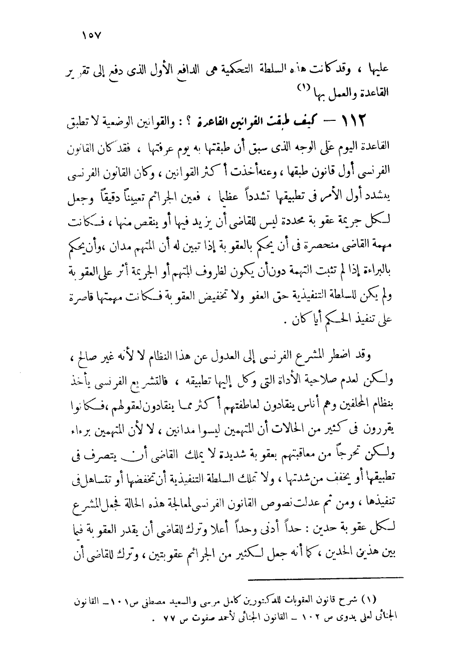112 - كيف طبقت القوانين القاعدة؟: والقوانين الوضعية لا تطبق القاعدة اليوم على الوجه الذي سبق أن طبقتها به يوم عرفتها، فقد كان القانون الفرنسي أول قانون طبقها، وعنه أخذت أكثر القوانين، وكان القانون الفرنسي يتشدد أول الأمر في تطبيقها تشدداً عظيماً، فعين الجرائم تعييناً دقيقاً وجعل لكل جريمة عقوبة محددة ليس للقاضي أن يزيد فيها أو ينقص منها، فكانت مهمة القاضي منحصرة في أن يحكم بالعقوبة إذا تبين له أن المتهم مدان، وأن يحكم بالبراءة إذا لم تثبت التهمة دون أن يكون لظروف المتهم أو الجريمة أثر على العقوبة، ولم يكن للسلطة التنفيذية حق العفو ولا تخفيض العقوبة، فكانت مهمتها قاصرة على تنفيذ الحكم أياً كان.