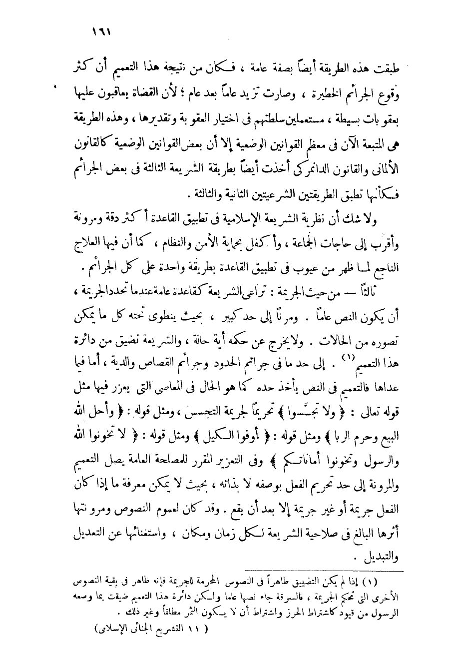 ثالثاً: من حيث الجريمة: تراعي الشريعة، كقاعدة عامة عندما تحدد الجريمة، أن يكون النص عاماً، ومرناً إلى حد كبير، بحيث ينطوي تحته كل ما يمكن تصوره من حالات، ولا يخرج عن حكمه أية حالة، والشريعة تضيق من دائرة هذا التعميم (¬1) إلى حد ما في جرائم الحدود وجرائم القصاص والدية، أما فيما عداها فالتعميم في النص يأخذ حده كما هو الحال في المعاصي التي يحزر فيها، مثل قوله تعالى: {وَلا تَجَسَّسُوا} [الحجرات: 12] تحريماً جريمة التجسس، ومثل قوله: {وَأَحَلَّ اللهُ الْبَيْعَ وَحَرَّمَ الرِّبَا} [البقرة: 275] ، ومثل قوله: {وَأَوْفُواْ الْكَيْلَ} [الشعراء: 181] ، ومثل قوله: {لاَ تَخُونُواْ اللهَ وَالرَّسُولَ وَتَخُونُواْ أَمَانَاتِكُمْ} [الأنفال: 27] ، وفي التعزير المقرر للمصلحة العامة يصل التعميم والمرونة إلى حد تحريم الفعل بوصفه لا بذاته، بحيث لا يمكن معرفة ما إذا كان الفعل جريمة أو غير جريمة إلا بعد أن يقع. وقد كان لعموم النصوص ومرونتها أثرها البالغ في صلاحية الشريعة لكل زمان ومكان، واستغنائها عن التعديل والتبديل.