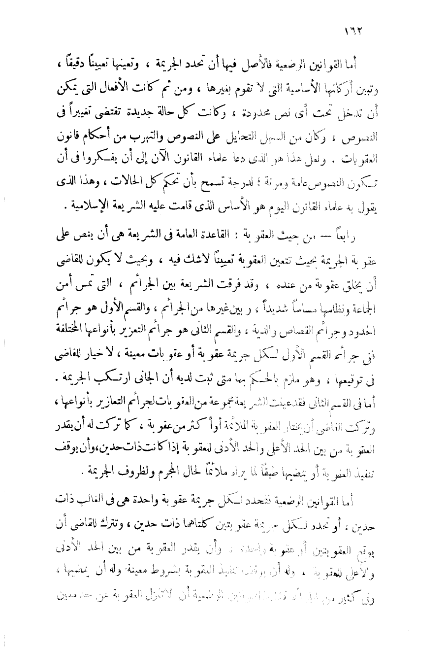 أما القوانين الوضعية فالأصل فيها أن تحدد الجريمة، وتعيينها تعييناً دقيقاً، وتبين أركانها الأساسية التي لا تقوم بغيرها، ومن ثم كانت الأفعال التي يمكن أن تدخل تحت أي نص محدودة، وكانت كل حلة جديدة تقتضي تغييراً في النصوص، وكان من السهل التحايل على النصوص والتهرب من أحكام قانون العقوبات. ولعل هذا هو الذي دعا علماء القانون الآن إلى أن يفكروا في أن تكون النصوص عامة ومرنة؛ لدرجة تسمح بأن تحكم كل الحالات، وهذا الذي يقوم به علماء القانون اليوم هو الأساس الذي قامت عليه الشريعة الإسلامية.