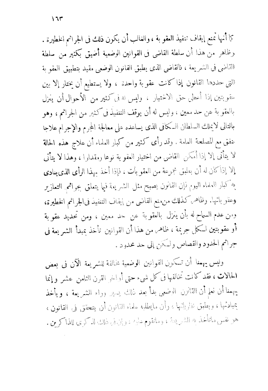 وظاهر كذلك من منع القاضي من إيقاف التنفيذ في الجرائم الخطيرة، ومن عدم السماح له بأن ينزل بالعقوبة عن حد معين، ومن تحديد عقوبة أو عقوبتين لكل جريمة، ظاهر من هذا أن القوانين تأخذ مبدأ الشريعة في جرائم الحدود والقصاص ولكن إلى حد محدود.