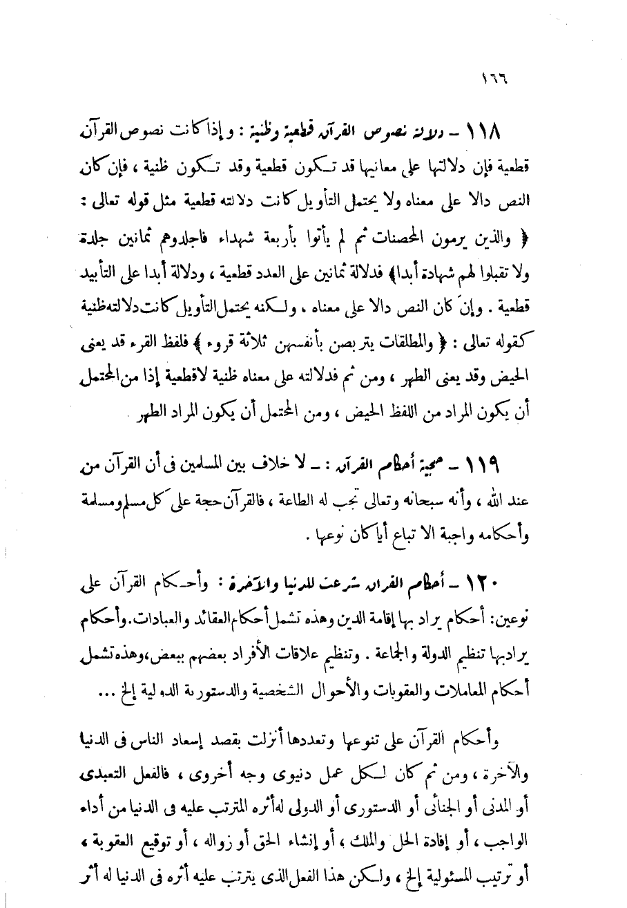 118 - دلالة نصوص القرآن قطعية وظنية: وإذا كانت نصوص القرآن قطعية فإن دلالتها على معانيها قد تكون قطعية وقد تكون ظنية. فإن كان النص دالاً على معناه ولا يحتمل التأويل كانت دلالته قطعية، مثل قوله تعالى: {وَالَّذِينَ يَرْمُونَ الْمُحْصَنَاتِ ثُمَّ لَمْ يَأْتُوا بِأَرْبَعَةِ شُهَدَاء فَاجْلِدُوهُمْ ثَمَانِينَ جَلْدَةً وَلا تَقْبَلُوا لَهُمْ شَهَادَةً أَبَدًا} [النور: 4] فدلالة ثمانين على العدد قطعية، ودلالة أبداً على التأبيد قطعية. وإن كان النص دالاً على معناه ولكنه يحتمل التأويل كانت دلالته ظنية، كقوله تعالى: {وَالْمُطَلَّقَاتُ يَتَرَبَّصْنَ بِأَنفُسِهِنَّ ثَلاَثَةَ قُرُوَءٍ} [البقرة: 228] فلحفظ القرء قد يعني الحيض وقد يعني الطهر، ومن ثم فدلالته على معناه ظنية لا قطعية، إذ من المحتمل أن يكون المراد من اللفظ الحيض، ومن المحتمل أن يكون المراد الطهر.