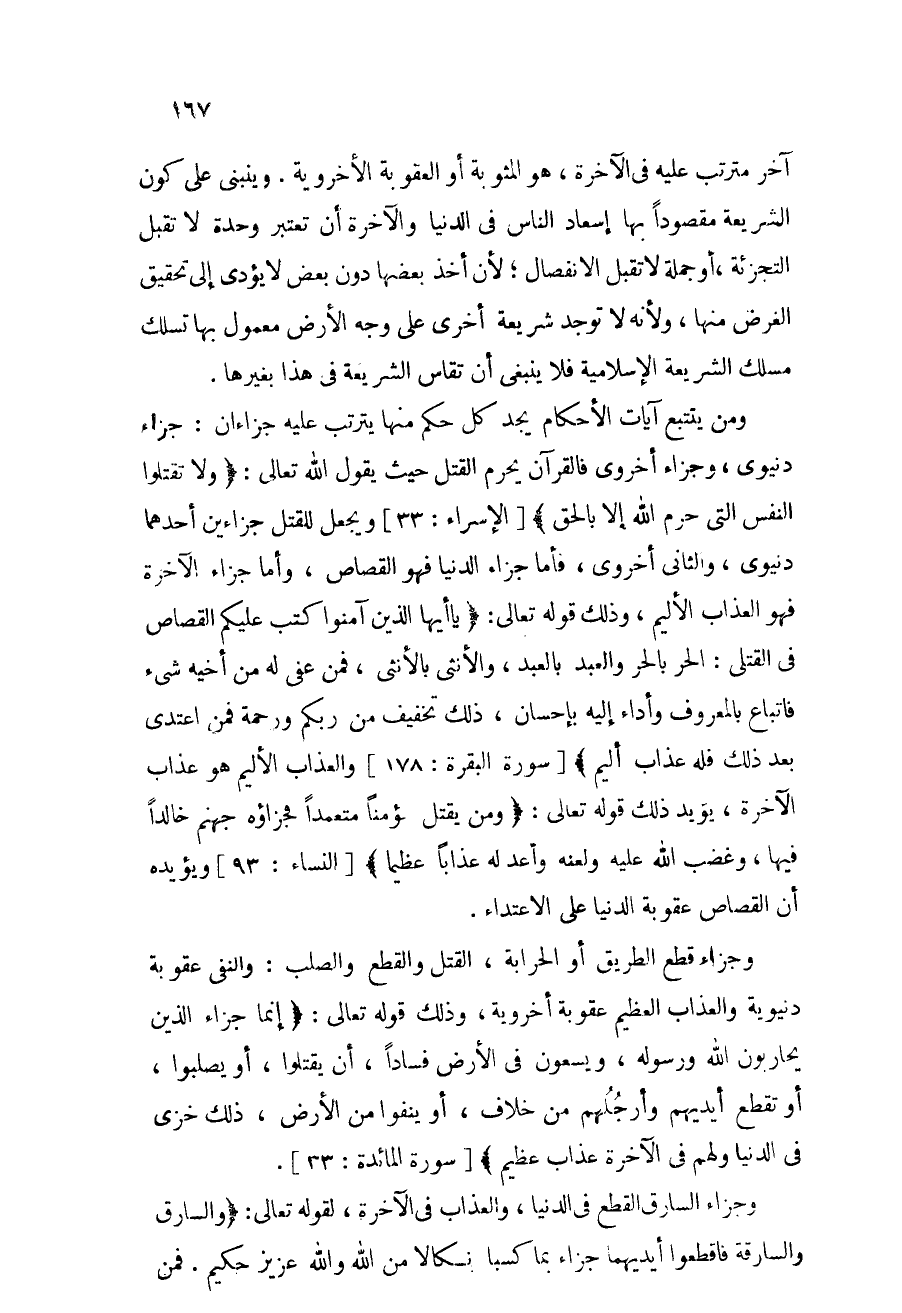 ومن يتتبع آيات الأحكام يجد كل حكم منها يترتب عليه جزاءان: جزاء دنيوي، وجزاء أخروي، فالقرآن يحرم القتل حيث يقول الله تعالى: {وَلاَ تَقْتُلُواْ النَّفْسَ الَّتِي حَرَّمَ اللهُ إِلاَّ بِالحَقِّ} [الإسراء: 33] ، ويجعل للقتل جزاءين أحدهما دنيوي، والثاني أخروي، فأما جزاء الدنيا فهو القصاص، وأما جزاء الآخرة فهو العذاب الأليم، وذلك قوله تعالى: {يَا أَيُّهَا الَّذِينَ آمَنُواْ كُتِبَ عَلَيْكُمُ الْقِصَاصُ فِي الْقَتْلَى الْحُرُّ بِالْحُرِّ وَالْعَبْدُ بِالْعَبْدِ وَالأُنثَى بِالأُنثَى فَمَنْ عُفِيَ لَهُ مِنْ أَخِيهِ شَيْءٌ فَاتِّبَاعٌ بِالْمَعْرُوفِ وَأَدَاء إِلَيْهِ بِإِحْسَانٍ ذَلِكَ تَخْفِيفٌ مِّن رَّبِّكُمْ وَرَحْمَةٌ فَمَنِ اعْتَدَى بَعْدَ ذَلِكَ فَلَهُ عَذَابٌ أَلِيمٌ} [البقرة: 178] ، والعذاب الأليم هو عذاب الآخرة، يؤيد ذلك قوله تعالى: {وَمَن يَقْتُلْ مُؤْمِنًا مُّتَعَمِّدًا فَجَزَآؤُهُ جَهَنَّمُ خَالِدًا فِيهَا وَغَضِبَ اللهُ عَلَيْهِ وَلَعَنَهُ وَأَعَدَّ لَهُ عَذَابًا عَظِيمًا} [النساء: 93] ، ويؤيده أن القصاص عقوبة الدنيا على الاعتداء.