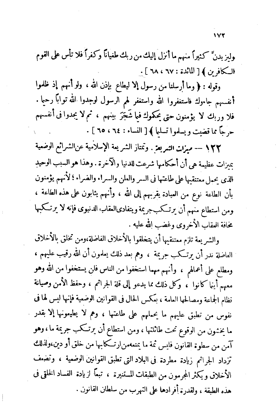 122 - ميزات الشريعة: وتمتاز الشريعة الإسلامية عن الشرائع الوضعية بميزات عظيمة هي أن أحكامها شرعت للدنيا والآخرة. وهذا هو السبب الوحيد الذي يحمل معتنقيها على طاعتها في السر والعلن والسراء والضراء؛ لأنهم يؤمنون بأن الطاعة نوع من العبادة يقربهم إلى الله، وأنهم يثابون على هذه الطاعة، ومن استطاع منهم أن يرتكب جريمة ويتفادى العقاب الدنيوي فإنه لا يرتكبها مخافة العقاب الأخروي وغضب الله عليه.