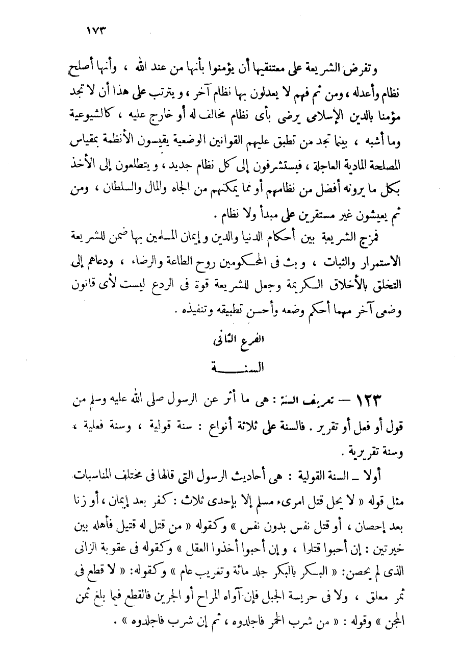 123 - تعريف السنة: هي ما أُثر عن الرسول - صلى الله عليه وسلم - من قول أو فعل أو تقرير. فالسنة على ثلاثة أنواع: سنة قولية، وسنة فعلية، وسنة تقريرية.