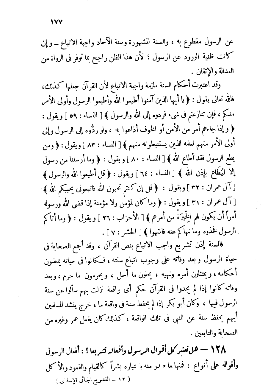 وقد اعتبرت أحكام السنة ملزمة واجبة الاتباع لأن القرآن جعلها كذلك، فالله تعالى يقول: {يَا أَيُّهَا الَّذِينَ آمَنُواْ أَطِيعُواْ اللهَ وَأَطِيعُواْ الرَّسُولَ وَأُوْلِي الأَمْرِ مِنكُمْ فَإِن تَنَازَعْتُمْ فِي شَيْءٍ فَرُدُّوهُ إِلَى اللهِ وَالرَّسُولِ} [النساء: 59] ، ويقول: {وَإِذَا جَاءهُمْ أَمْرٌ مِّنَ الأَمْنِ أَوِ الْخَوْفِ أَذَاعُواْ بِهِ وَلَوْ رَدُّوهُ إِلَى الرَّسُولِ وَإِلَى أُوْلِي الأَمْرِ مِنْهُمْ لَعَلِمَهُ الَّذِينَ يَسْتَنبِطُونَهُ مِنْهُمْ} [النساء: 83] ، ويقول: {مَّنْ يُطِعِ الرَّسُولَ فَقَدْ أَطَاعَ اللهَ} [النساء: 80] ، ويقول: {وَمَا أَرْسَلْنَا مِن رَّسُولٍ إِلاَّ لِيُطَاعَ بِإِذْنِ اللهِ} [النساء: 64] ، ويقول: {قُلْ أَطِيعُواْ اللهَ وَالرَّسُولَ} [آل عمران: 32] ، ويقول: {قُلْ إِن كُنتُمْ تُحِبُّونَ اللهَ فَاتَّبِعُونِي يُحْبِبْكُمُ اللهُ} [آل عمران: 31] ، ويقول: {وَمَا كَانَ لِمُؤْمِنٍ وَلَا مُؤْمِنَةٍ إِذَا قَضَى اللَّهُ وَرَسُولُهُ أَمْرًا أَن يَكُونَ لَهُمُ الْخِيَرَةُ مِنْ أَمْرِهِمْ} [الأحزاب: 36] ، ويقول: {وَمَا آتَاكُمُ الرَّسُولُ فَخُذُوهُ وَمَا نَهَاكُمْ عَنْهُ فَانتَهُوا} [الحشر: 7] .