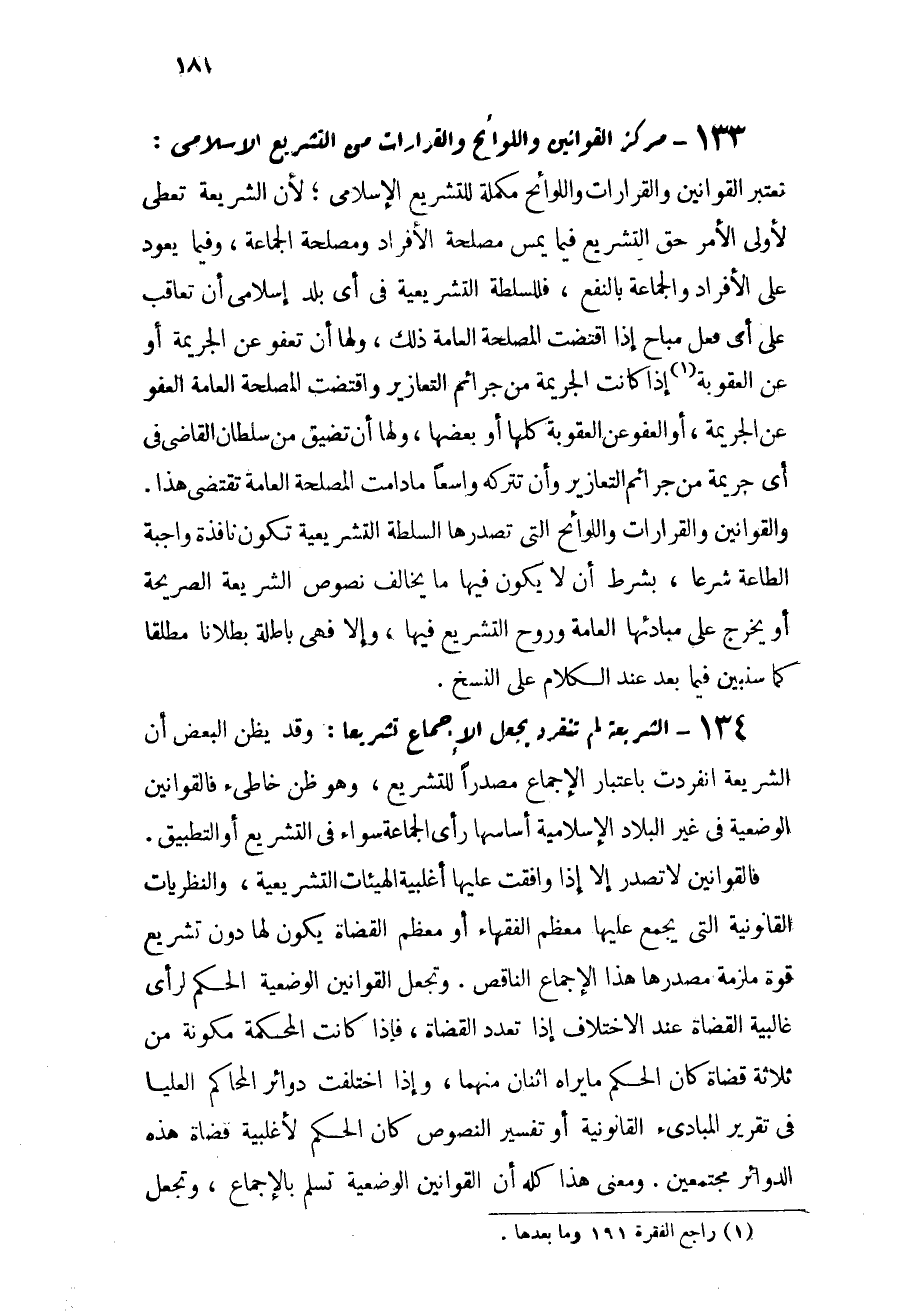 133 - مركز القوانين واللوائح والقرارات من التشريع الإسلامي: تعتبر القوانين والقرارات واللوائح مكملة للتشريع الإسلامي؛ لأن الشريعة تعطي لأولي الأمر حق التشريع فيما يمس مصلحة الأفراد ومصلحة الجماعة، وقيما يعود على الأفرادوالجماعة بالنفع، فللسلطة التشريعية في أي بلد إسلامي أن تعاقب على أي فعل مباح إذا اقتضت المصلحة العامة ذلك، ولها أن تعفو عن الجريمة أو عن العقوبة (¬1) إذا كانت الجريمة من جرائم التعازير واقتضت المصلحة العامة العفو عن الجريمة، أو العفو عن العقوبة كلها أو بعضها، ولها أن تضيق من سلطان القاضي في أي جريمة من جرائم التعازير وأن تتركه واسعاً ما دامت المصلحة العامة تقتضي هذا. والقوانين والقرارات واللوائح التي تصدرها السلطة التشريعية تكون نافذة واجبة الطاعة شرعاً، وبشرط أن لا يكون فيها ما يخالف نصوص الشريعة الصريحة أو يخرج على مبادئها العامة وروح التشريع فيها، وإلا فهي باطلة بطلاناً مطلقاً، كما سنبين فيما بعد عند الكلام على النسخ.