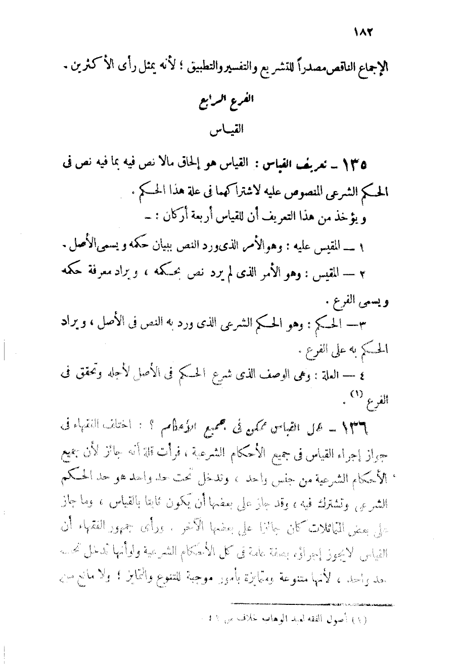 135 - تعريف القياس: القياس هو إلحاق ما لا نص فيه نص في الحكم الشرعي المنصوص عليه لاشتراكهما في علة هذا الحكم.