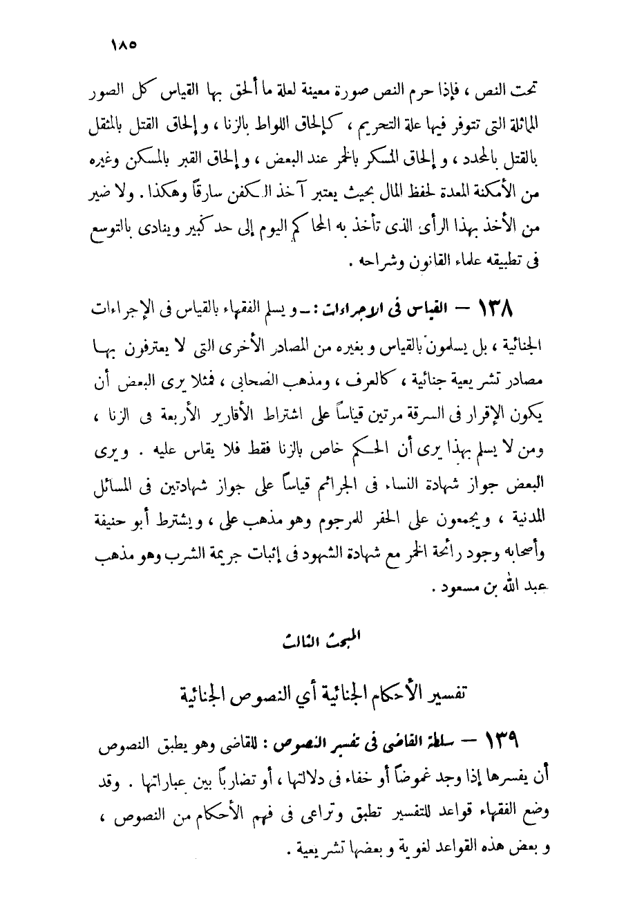 138 - القياس في الإجراءات: ويسلم الفقهاء بالقياس في الإجراءات الجنائية، بل يسلمون بالقياس وبغيره من المصادر الأخرى التي لا يعترفون بها مصادر تشريعية جنائية، كالعرف، ومذهب الصحابي، فمثلاً يرى البعض أن يكون الإقرار في السرقة مرتين قياساً على اشتراط الأقارير الأربعة في الزنا، ومن لا يسلم بهذا يرى أن الحكم بالزنا فقط فلا قياس عليه. ويرى البعض جواز شهادة النساء في الجرائم قياساً على جواز شهادتين في المسائل المدنية. ويجمعون على الحفر للمرجوم، وهو مذهب علي. ويشترط أبو حنيفة وأصحابه وجود رائحة الخمر مع شهادة الشهود في إثبات جريمة الشرب، وهو مذهب عبد الله بن مسعود.