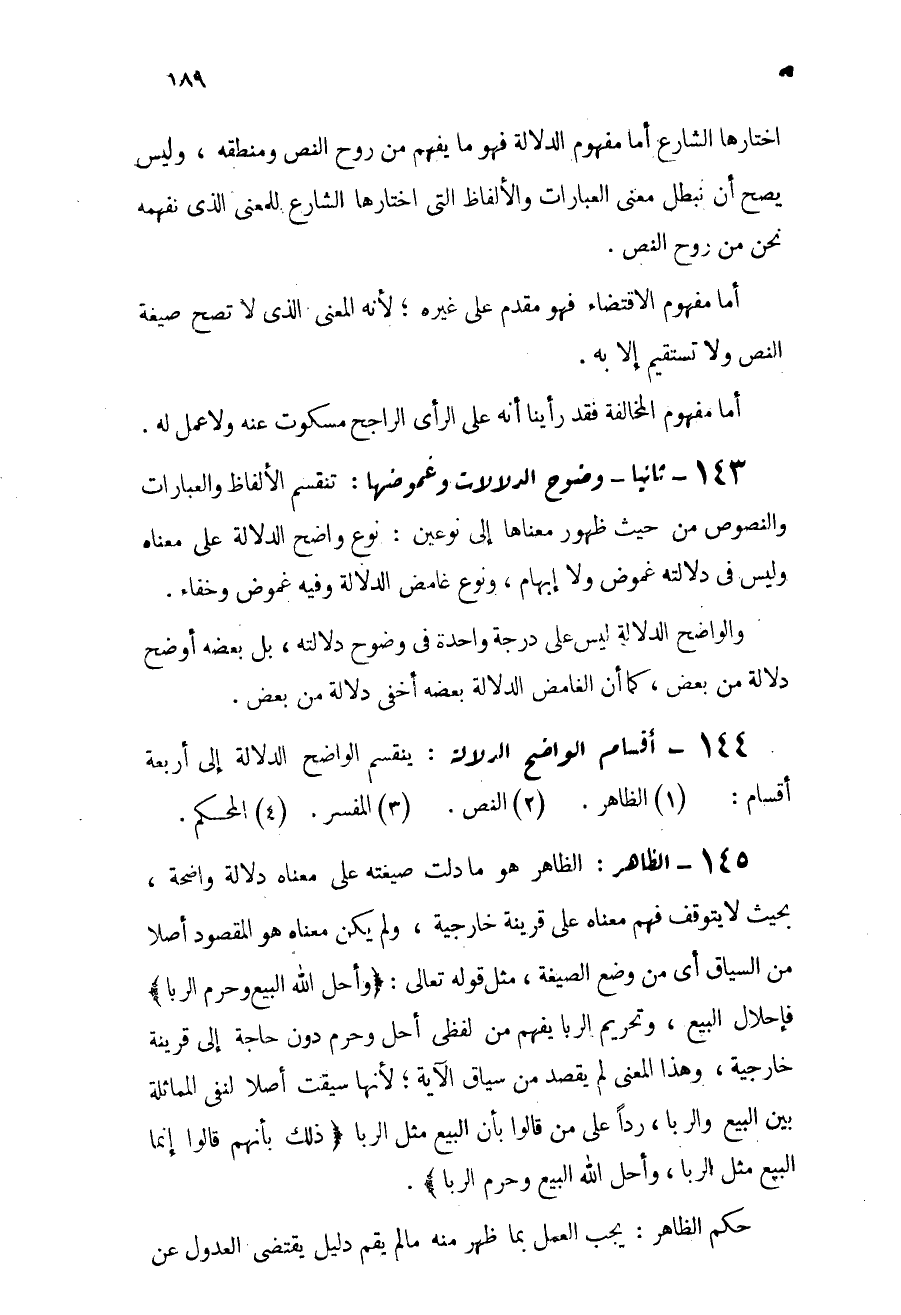 145 - الظاهر: الظاهر هو ما دلت صيغته على معناه دلالة واضحة، بحيث لا يتوقف فهم معناه على قرينة خارجية، ولم يكن معناه هو المقصود أصلاً من السياق أي من وضع الصيغة، مثل قوله تعالى: {وَأَحَلَّ اللهُ الْبَيْعَ وَحَرَّمَ الرِّبَا} [البقرة: 275] ، فإحلال البيع وحرم الربا يفهم من لفظي "أحل" و"حرم" دون حاجة إلى قرينة خارجية، وهذا المعنى لم يقصد من سياق الآية؛ لأنها سيقت أصلاً لنفي المماثلة بين البيع والربا، رداً على من قالوا بأن البيع مثل الربا: {بِأَنَّهُمْ قَالُواْ إِنَّمَا الْبَيْعُ مِثْلُ الرِّبَا وَأَحَلَّ اللهُ الْبَيْعَ وَحَرَّمَ الرِّبَا} [البقرة: 275] .