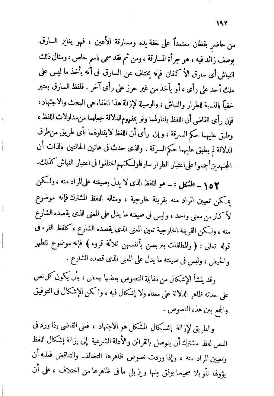152 - المشكل: هو اللفظ الذي لا يدل بصيغته على المراد منه، ولكن يمكن تعيين المراد منه بقرينة خارجية. ومثاله اللفظ المشترك؛ فإنه موضوع لأكثر من معنى واحد، وليس في صيغته ما يدل على المعنى الذي يقصده الشارع منه، ولكن القرينة الخارجية تعين المعنى الذي يقصده الشارع، كلفظ القرء في قوله تعالى: {وَالْمُطَلَّقَاتُ يَتَرَبَّصْنَ بِأَنفُسِهِنَّ ثَلاَثَةَ قُرُوَءٍ} [البقرة: 228] فإنه موضوع للطهر والحيض، وليس في صيغته ما يدل على المعنى الذي قصده الشارع.