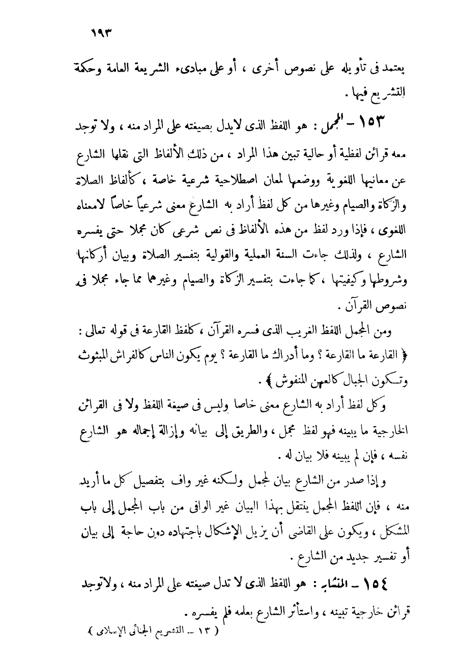 153 - المجمل: هو اللفظ الذي لا يدل بصيغته على المراد منه، ولا توجد معه قرائن لفظية أو حالية تبين هذا المراد. من ذلك الألفاظ التي نقلها الشارع عن معانيها اللفظية ووضعها لمعان اصطلاحية شرعية خاصة، كألفاظ الصلاة والزكاة والصيام وغيرها من كل لفظ أراد به الشارع معنى شرعياً خاصاً لا معناه اللغوي، فإذا ورد لفظ من هذه الألفاظ في نص شرعي كان مجملاً حتى يفسره الشارع، ولذلك جاءت السنة العملية والقولية بتفسير الصلاة وبيان أركانها وشروطها وكيفيتها، كما جاءت بتفسير الزكاة والصلاة وغيرهما مما جاء مجملاً في نصوص القرآن.