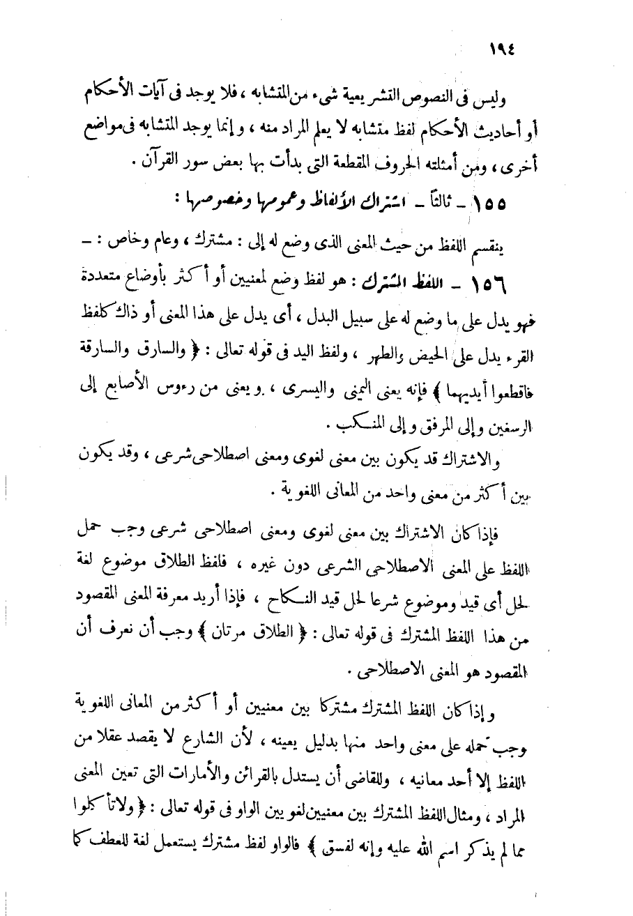 156 - اللفظ المشترك: هو لفظ وضع المعنيين أو أكثر بأوضاع متعددة فهو يدل على ما وضع له على سبيل البدل، أي يدل على هذا المعنى أو ذاك؛ كلفظ القرء يدل على الحيض والطهر، ولفظ اليد في قوله تعالى: {وَالسَّارِقُ وَالسَّارِقَةُ فَاقْطَعُواْ أَيْدِيَهُمَا} [المائدة: 38] فإنه يعني اليمنى واليسرى، ويعني من رءوس الأصابع إلى الرسغين وإلى المرفق وإلى المنكب.