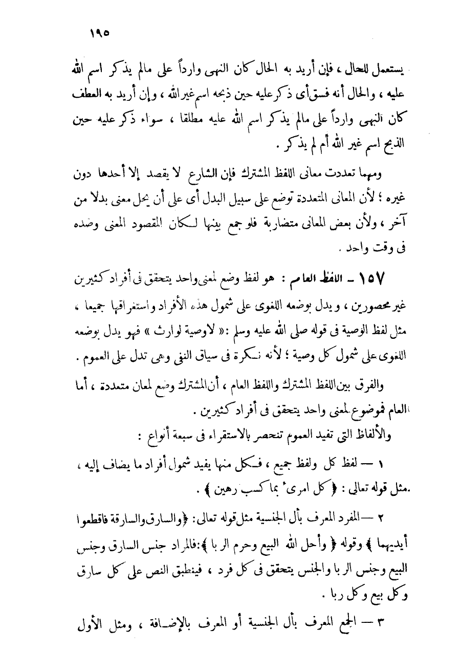 157 - اللفظ العام: هو لفظ وضع لمعنى واحد يتحقق في أفراد كثيرين غير محصورين، ويدل بوضعه اللغوي على شمول هذه الأفراد واستغراقها جميعاً، مثل لفظ الوصية في قوله - صلى الله عليه وسلم -: "لا وصية لوارث" فهو يدل بوضعه اللغوي على شمول كل وصية؛ لأنه نكرة في سياق النفي وهي تدل على العموم.
