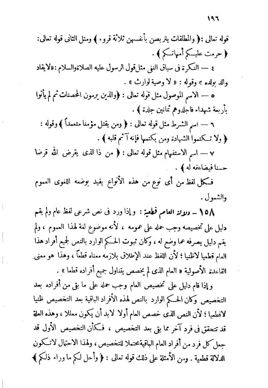 158 - دلالة العام قطعية: وإذا ورد في نص شرعي لفظ عام ولم يقم دليل على تخصيصه وجب حمله على عمومه، لأنه موضوع لغة لهذا العموم، ولم يقم دليل يصرفه عما وضع له، وكان ثبوت الحكم الوارد بالنص لجميع أفراد هذا العام قطعياً لا ظنياً؛ لأن اللفظ عند الإطلاق يلازمه معناه قطعاً، وهذا هو معنى القاعدة الأصولية: "العام الذي لم يخصص يتناول جميع أفراده قطعاً".