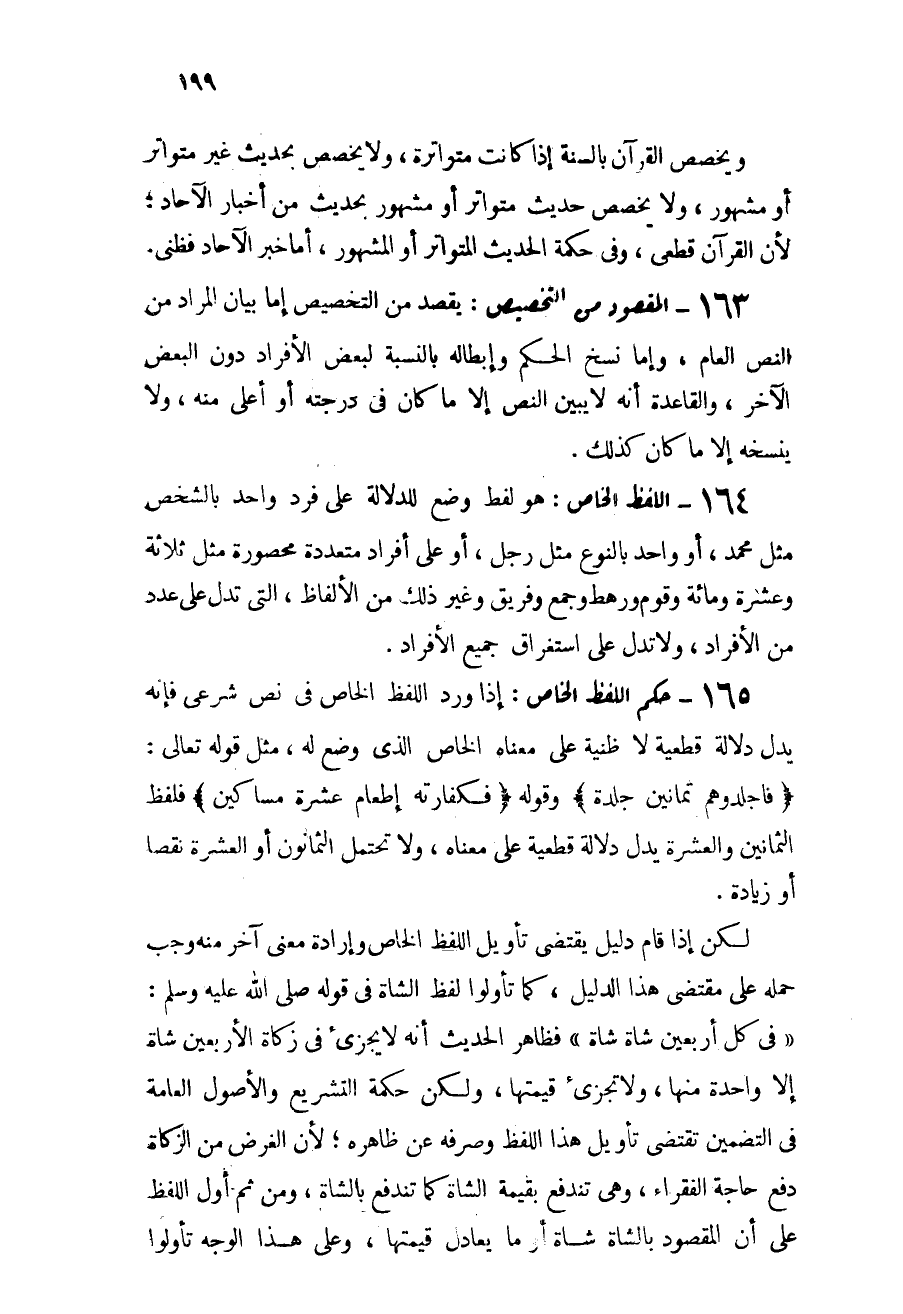 165 - حكم اللفظ الخاص: إذا ورد اللفظ الخاص في نص شرعي فإنه يدل دلالة قطعية لا ظنية على معناه الخاص الذي وضع له، مثل قوله تعالى: {فَاجْلِدُوهُمْ ثَمَانِينَ جَلْدَةً} [النور: 4] ، وقوله: {فَكَفَّارَتُهُ إِطْعَامُ عَشَرَةِ مَسَاكِينَ} [المائدة: 89] ، فلفظ الثمانين والعشرة يدل دلالة قطعية على معناه، ولا تحتمل الثمانون أو عشرة نقصاً أو زيادة.