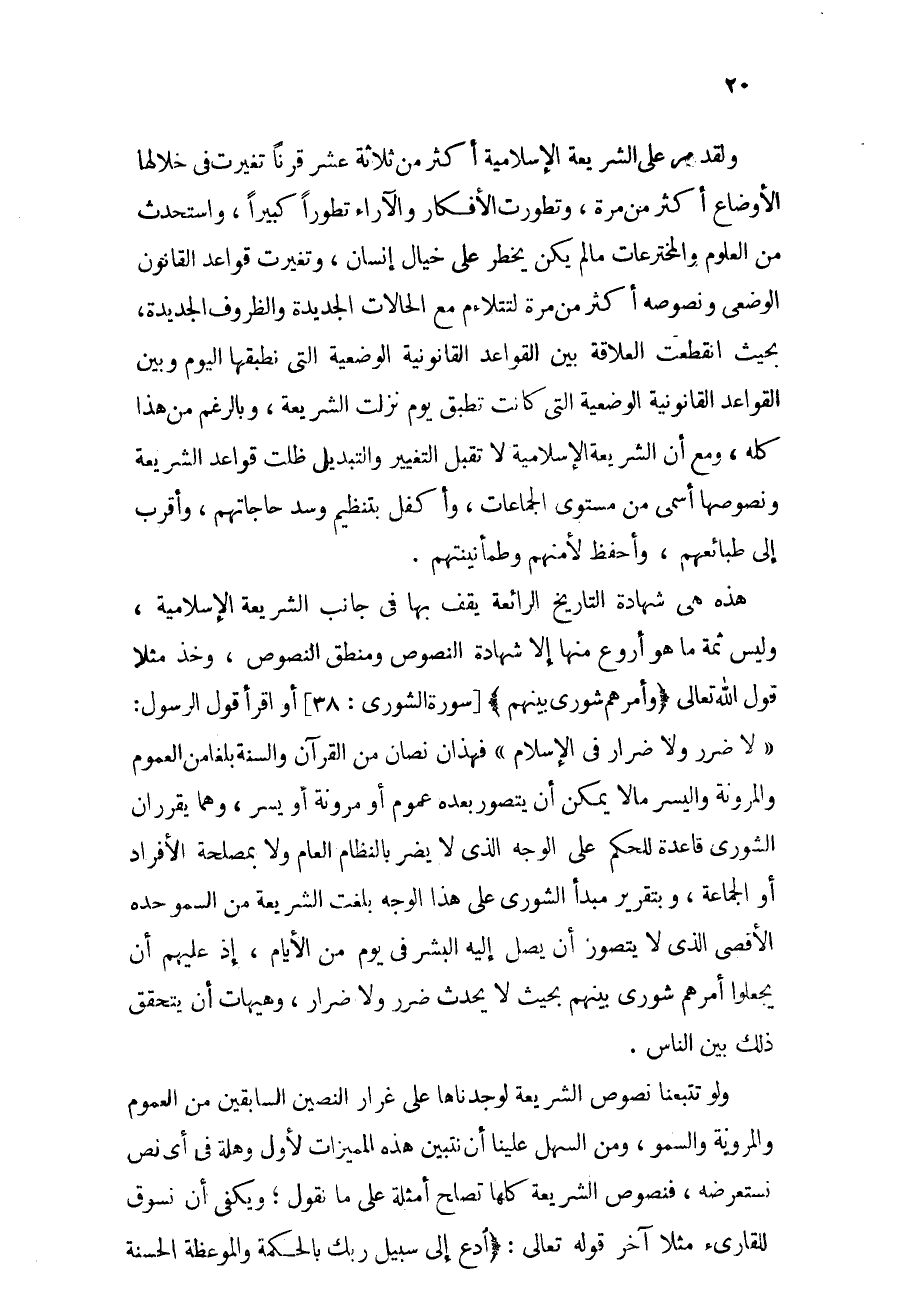 هذه هي شهادة التاريخ الرائعة يقف بها في جانب الشريعة الإسلامية، وليس ثمة ما هو أروع منها إلا شهادة النصوص ومنطق النصوص، وخذ مثلاً قول الله تعالى: {وَأَمْرُهُمْ شُورَى بَيْنَهُمْ} [الشورى: 38] ، أو اقرأ قول الرسول: "لا ضرر ولا ضرار في الإسلام"، فهذان نصان من القرآن والسنة بلغا من العموم والمرونة واليسر ما لا يمكن أن يتصور بعده عموم أو مرونة أو يسر، وهما يقرران الشورى قاعدة للحكم على الوجه الذي لا يضر بالنظام العام ولا بمصلحة الأفراد أو الجماعة، وبتقرير مبدأ الشورى على هذا الوجه بلغت الشريعة من السمو حده الأقصى الذي لا يتصور أن يصل إليه البشر في يوم من الأيام، إذ عليهم أن يجعلوا أمرهم شورى بينهم بحيث لا يحدث ضرر ولا ضرار، وهيهات أن يتحقق ذلك بين الناس.