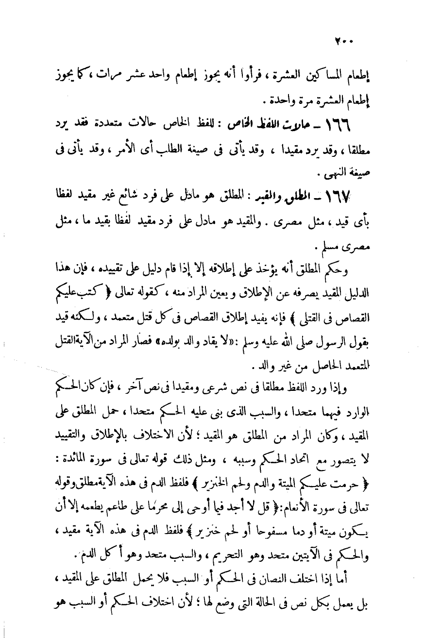 167 - المطلق والمقيد: المطلق هو ما دل على فرد شائع غير مقيد لفظاً بأي قيد، مثل مصري والمقيد هو ما دل على فرد مقيد لفظاً بقيد ما، مثل مصري مسلم.