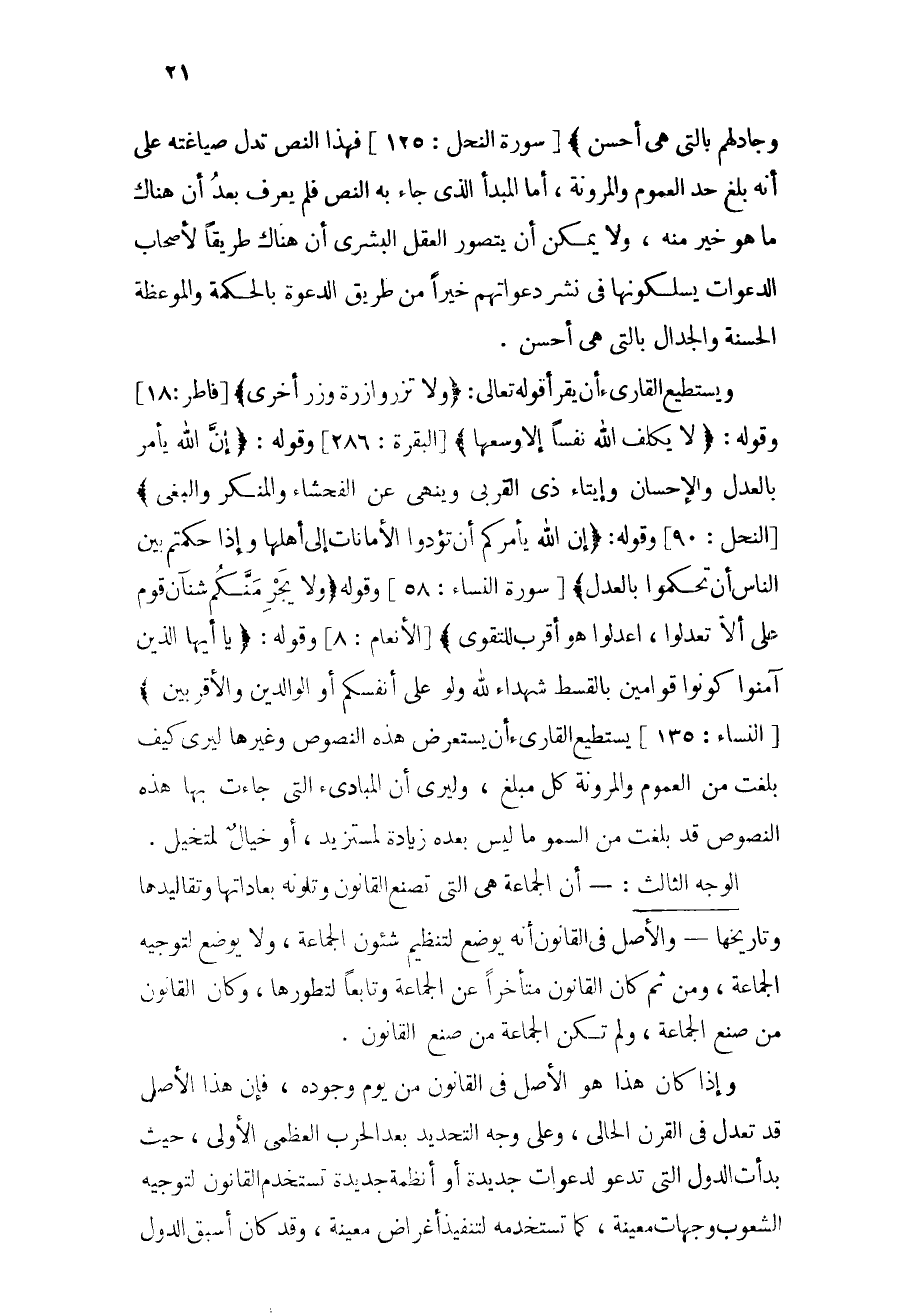 ويستطيع القارئ أن يقرأ قوله تعالى: {وَلا تَزِرُ وَازِرَةٌ وِزْرَ أُخْرَى} [فاطر: 18] ، وقوله: {لاَ يُكَلِّفُ اللهُ نَفْسًا إِلاَّ وُسْعَهَا} [البقرة: 286] ، وقوله: {إِنَّ اللهَ يَأْمُرُ بِالْعَدْلِ وَالإِحْسَانِ وَإِيتَاء ذِي الْقُرْبَى وَيَنْهَى عَنِ الْفَحْشَاء وَالْمُنكَرِ وَالْبَغْيِ} [النحل:90] ، وقوله: {إِنَّ اللهَ يَأْمُرُكُمْ أَن تُؤدُّواْ الأَمَانَاتِ إِلَى أَهْلِهَا وَإِذَا حَكَمْتُم بَيْنَ النَّاسِ أَن تَحْكُمُواْ بِالْعَدْلِ} [النساء: 58] ، وقوله: {وَلاَ يَجْرِمَنَّكُمْ شَنَآنُ قَوْمٍ عَلَى أَلاَّ تَعْدِلُواْ اعْدِلُواْ هُوَ أَقْرَبُ لِلتَّقْوَى} [المائدة: 8] ، وقوله: {يَا أَيُّهَا الَّذِينَ آمَنُواْ كُونُواْ قَوَّامِينَ بِالْقِسْطِ شُهَدَاء لِلّهِ وَلَوْ عَلَى أَنفُسِكُمْ أَوِ الْوَالِدَيْنِ وَالأَقْرَبِينَ} [النساء: 135] ، يستطيع القارئ أن يستعرض هذه النصوص وغيرها ليرى كيف بلغت من العموم والمرونة كل مبلغ، وليرى أن المبادئ التي جاءت بها هذه النصوص قد بلغت من السمو ما ليس بعده زيادة لمستزيد، أو خيال لمتخيل.