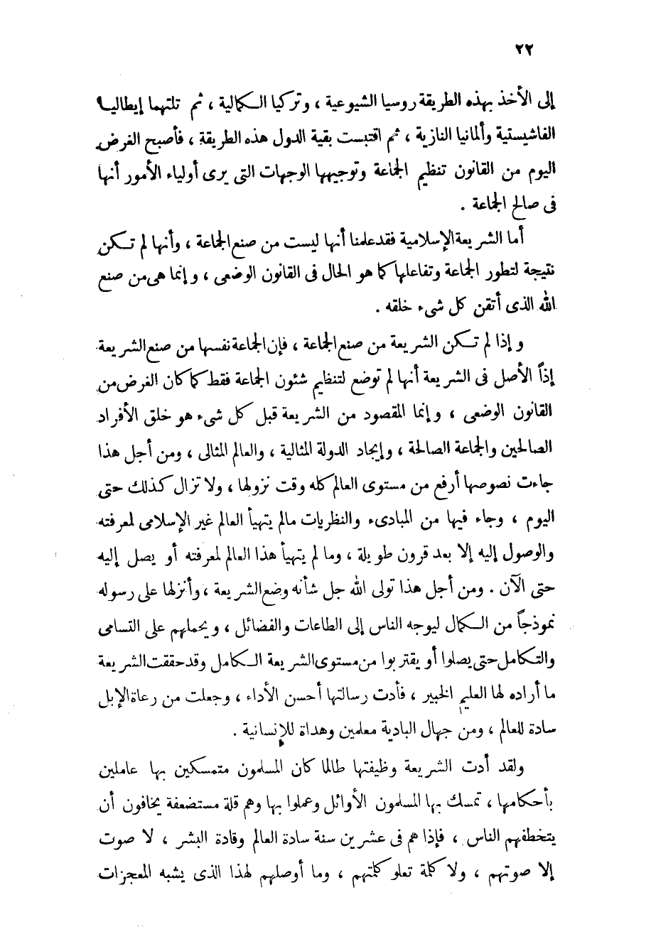 أما الشريعة الإسلامية فقد علمنا أنها ليست من صنع الجماعة، وأنها لم تكن نتيجة لتطور الجماعة وتفاعلها كما هو الحال في القانون الوضعي، وإنما هي من صنع الله الذي أتقن كل شئ خلقه. وإذا لم تكن الشريعة من صنع الجماعة، فإن الجماعة نفسها من صنع الشريعة.