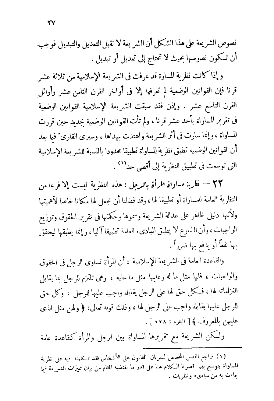 22 - نظرية مساواة المرأة بالرجل: هذه النظرية ليست إلا فرعاً من النظرية العامة للمساواة أو تطبيقاً لها، وقد فضلنا أن نجعل لها مكاناً خاصاً لأهميتها ولأنها دليل ظاهر على عدالة الشريعة وسموها وحكمتها في تقرير الحقوق وتوزيع الواجبات، وأن الشارع لا يطبق المبادئ العامة تطبيقاً آلياً، وإنما يطبقها ليحقق بها نفعاً أو يدفع بها ضرراً.
