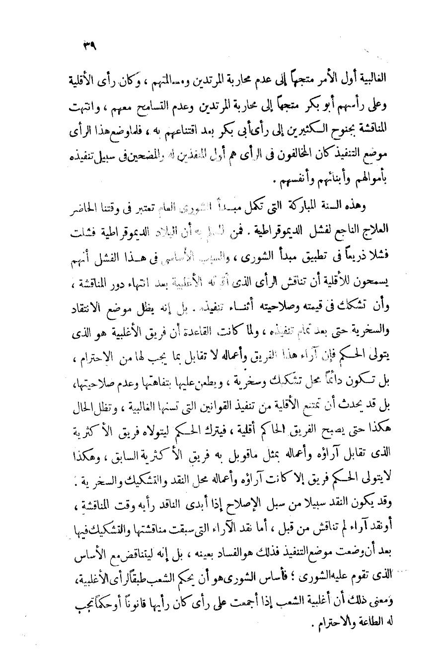 ولما كانت القاعدة أن فريق الأغلبية هو الذي يتولى الحكم فإن آراء هذا الفريق وأعماله لا تقابل بما يجب لها من الاحترام، بل تكون دائماً محل تشكيك وسخرية ويطعن عليها بتفاهتها وعدم صلاحيتها، بل قد يحدث أن تمتنع الأقلية من تنفيذ القوانين التي تسنها الغالبية، وتظل الحال هكذا حتى يصبح الفريق الحاكم أقلية، فيترك الحكم ليتولاه فريق الأكثرية الذي تقابل آراؤه وأعماله بمثل ما قوبل به فريق الأكثرية السابق، وهكذا لا يتولى الحكم فريق إلا كانت آراؤه وأعماله محل النقد والتشكيك والسخرية. وقد يكون النقد سبيلاً من سبل الإصلاح إذا أبدى الناقد رأيه وقت المناقشة أو نقد آراء لم تناقش من قبل، أما نقد الآراء التي سبقت مناقشتها والتشكيك فيها بعد أن وضعت موضع التنفيذ فذلك هو الفساد بعينه، بل إنه ليتناقض مع الأساس الذي تقوم عليه الشورى؛ فأساس الشورى هو أن يحكم الشعب طبقاً لرأي الأغلبية، ومعنى ذلك أن أغلبية الشعب إذا أجمعت على رأي كان رأيها قانوناً أو حكماً تجب له الطاعة والاحترام.