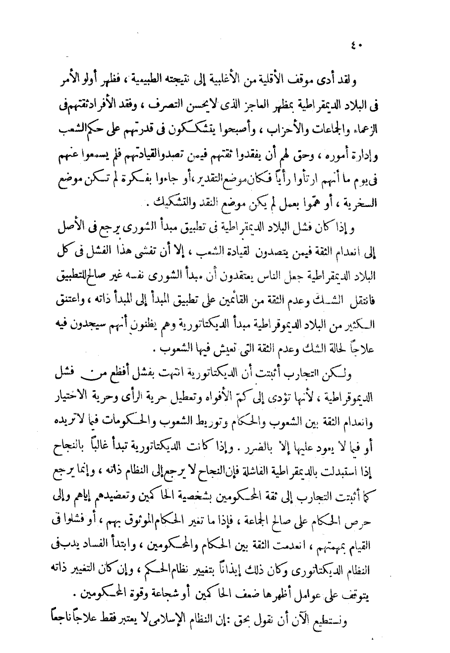 وإذا كان فشل البلاد الديموقراطية في تطبيق مبدأ الشورى يرجع في الأصل إلى انعدام الثقة فيمن يتصدون لقيادة الشعب، إلا أن تفشي هذا الفشل في كل البلاد الديموقراطية جعل الناس يعتقدون أن مبدأ الشورى نفسه غير صالح للتطبيق، فانتقل الشك وعدم الثقة من القائمين على تطبيق المبدأ إلى المبدأ ذاته، واعتنق كثير من البلاد الديموقراطية مبدأ الديكتاتورية وهم يظنون أنهم سيجدون فيه علاجاً لحالة الشك وعدم الثقة التي تعيش فيها الشعوب.