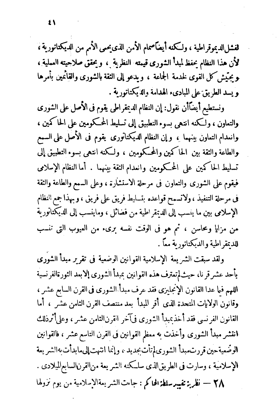لفشل الديموقراطية، ولكنه أيضاً صمام الأمن الذي يحمي الأمم من الديكتاتورية، لأن هذا النظام يحفظ لمبدأ الشورى قيمته النظرية، ويحقق صلاحيته العملية، ويجيش كل القوى لخدمة الجماعة، ويدعو إلى الثقة بالشورى والقائمين بأمرها، ويسد الطريق على المبادئ الهدامة والديكتاتورية.