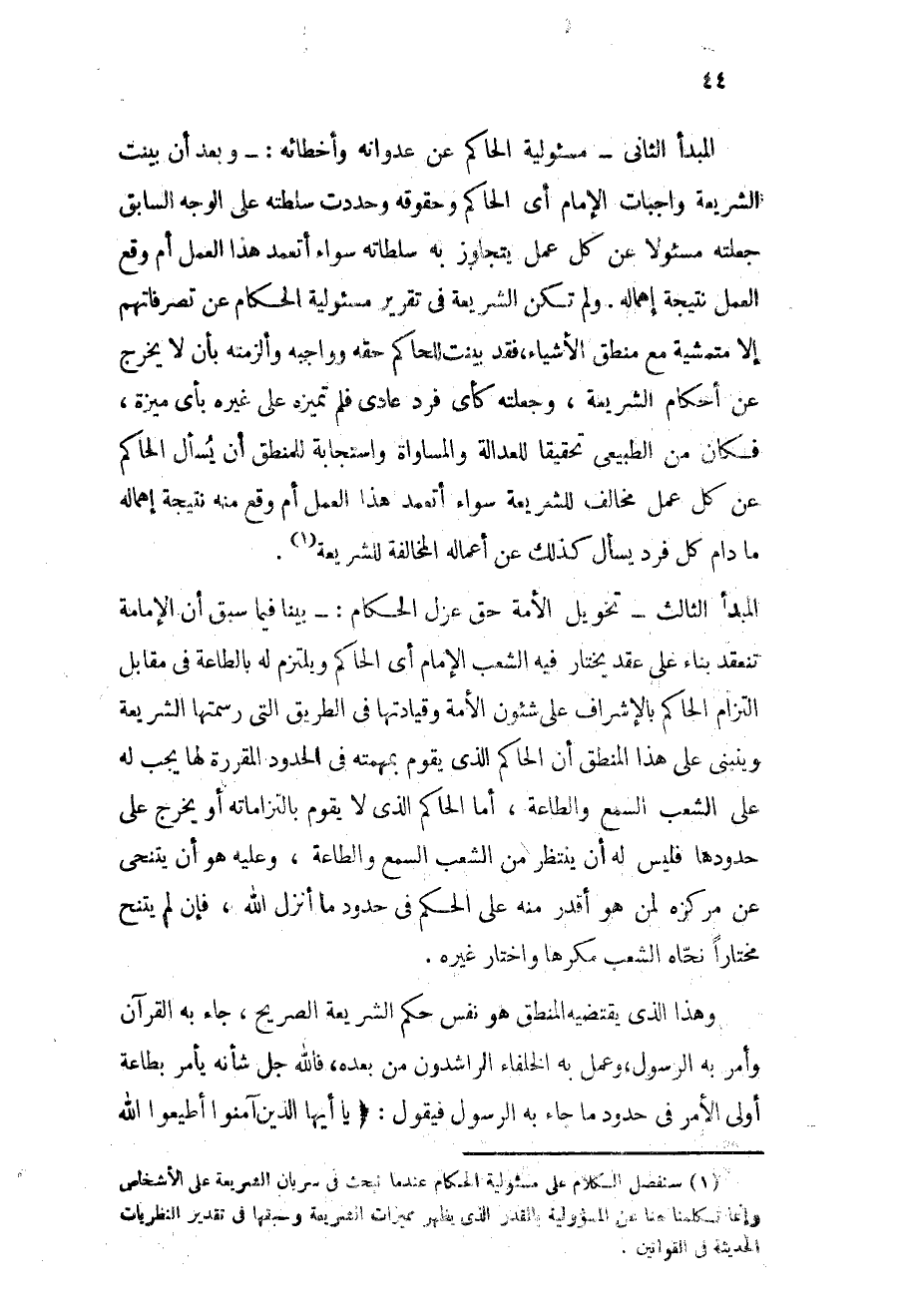 وهذا الذي يقتضيه المنطق هو نفس حكم الشريعة الصريح، جاء به القرآن وأمر به الرسول، وعمل به الخلفاء الراشدين من بعده، فالله جل شأنه يأمر بطاعة أولي الأمر في حدود ما جاء به الرسول فيقول: {يَا أَيُّهَا الَّذِينَ آمَنُواْ أَطِيعُواْ اللهَ
