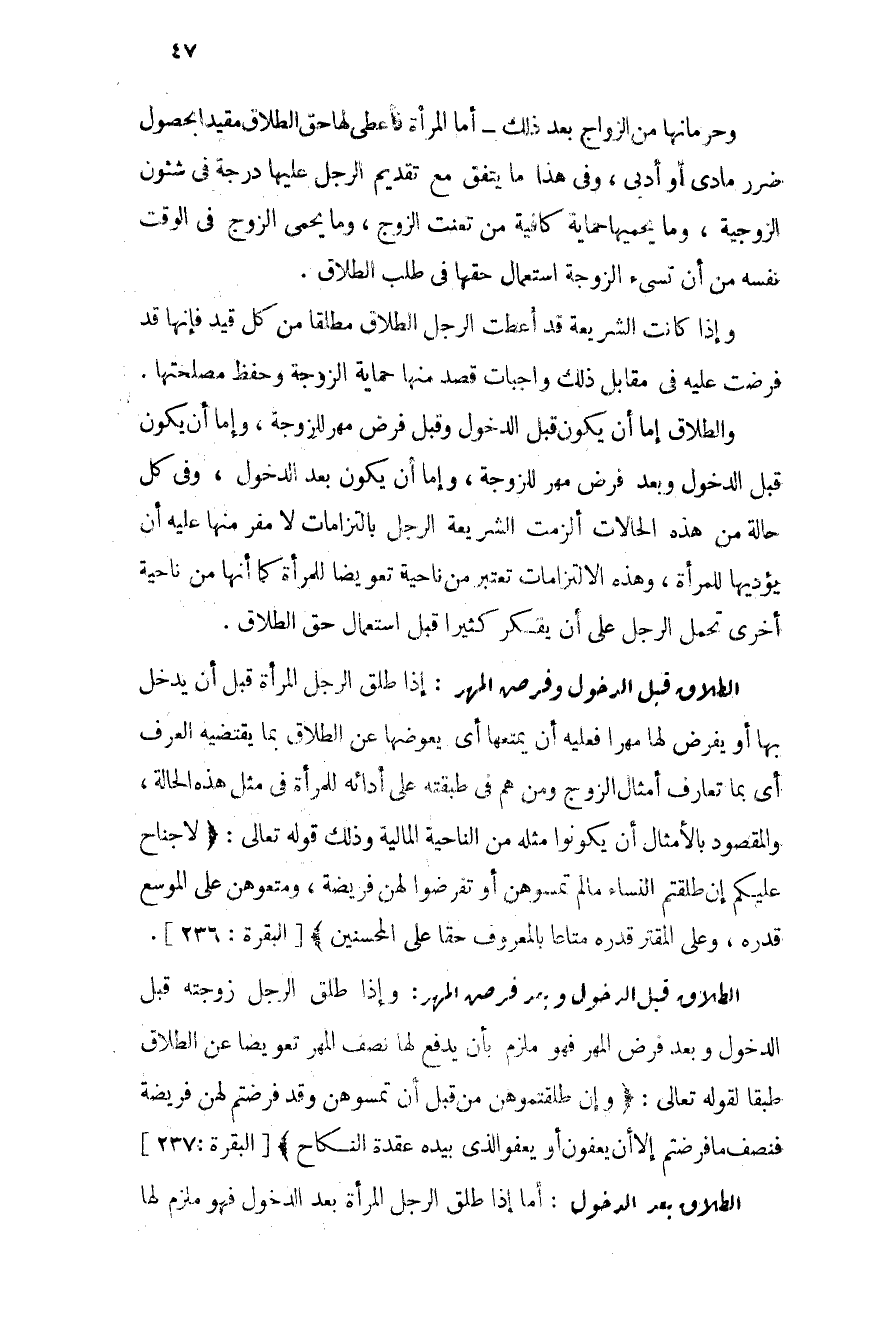 وحرمانها من الزواج بعد ذلك. أما المرأة فأعطى لها حق الطلاق مقيداً بحصول ضرر مادي أو أدبي، وفي هذا ما يتفق مع تقديم الرجل عليها درجة في شئون الزوجية، وما يحميها حماية كافية من تعنت الزوج، وما يحمي الزوج في الوقت نفسه من أن تسئ الزوجة استعمال حقها في طلب الطلاق.