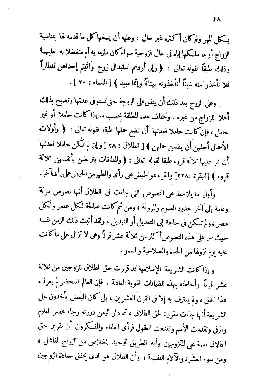 وإذا كانت الشريعة الإسلامية قد قررت حق الطلاق للزوجين من ثلاثة عشر قرناً وأحاطته بهذه الضمانات القوية العادلة، فإن العالم المتحضر لم يعرف هذا الحق ولم يعترف به إلا في القرن العشرين، بل كان البعض يأخذون على الشريعة أنها جاءت مقررة لحق الطلاق، ثم دار الزمن دورته وجاء عصر العلوم والرقي وتقدمت الأمم وتفتحت العقول، فرأى العلماء والمفكرون أن تقرير حق الطلاق نعمة على المتزوجين وأنه الطريق الوحيد للخلاص من الزواج الفاشل، ومن سوء العشرة ومن الآلام النفسية، وأن الطلاق هو الذي يحقق سعادة الزوجين