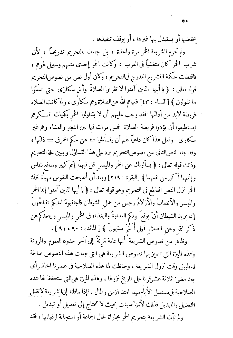 ولم تحرم الشريعة الخمر مرة واحدة، بل جاءت بالتحريم تدريجياً، لأن شرب الخمر كان متفشياًٍ في العرب، وكانت الخمر إحدى متعهم وسبيل لهوهم، فاقتضت حكمة التشريع التدرج في التحريم، وكان أول نص من نصوص التحريم قوله تعالى: {يَا أَيُّهَا الَّذِينَ آمَنُواْ لاَ تَقْرَبُواْ الصَّلاَةَ وَأَنتُمْ سُكَارَى حَتَّىَ تَعْلَمُواْ مَا تَقُولُونَ} [النساء: 43] ، فنهاهم الله عن الصلاة وهم سكارى، ولما كانت الصلاة فريضة لابد من أدائها فقد وجب عليهم أن لا يتناولوا الخمر بكميات تسكرهم ليستطيعوا أن يؤدوا فريضة الصلاة خمس مرات فيما بين الفجر والعشاء وهم غير سكارى، ولعل هذا كان داعياً لهم أن يتساءلوا عن حكم الخمر في ذاتها، وقد جاء النص الثاني من نصوص التحريم يرد على هذا التساؤل ويبين علة التحريم، وذلك قوله تعالى: {يَسْأَلُونَكَ عَنِ الْخَمْرِ وَالْمَيْسِرِ قُلْ فِيهِمَا إِثْمٌ كَبِيرٌ وَمَنَافِعُ لِلنَّاسِ وَإِثْمُهُمَآ أَكْبَرُ مِن نَّفْعِهِمَا} [البقرة: 219] ، وبعد أن أصبحت النفوس مهيأة لترك الخمر نزل النص القاطع في التحريم وهو قوله تعالى: {يَا أَيُّهَا الَّذِينَ آمَنُواْ إِنَّمَا الْخَمْرُ وَالْمَيْسِرُ وَالأَنصَابُ وَالأَزْلاَمُ رِجْسٌ مِّنْ عَمَلِ الشَّيْطَانِ فَاجْتَنِبُوهُ لَعَلَّكُمْ تُفْلِحُونَ* إِنَّمَا يُرِيدُ الشَّيْطَانُ أَن يُوقِعَ بَيْنَكُمُ الْعَدَاوَةَ وَالْبَغْضَاء فِي الْخَمْرِ وَالْمَيْسِرِ وَيَصُدَّكُمْ عَن ذِكْرِ اللهِ وَعَنِ الصَّلاَةِ فَهَلْ أَنتُم مُّنتَهُونَ} [المائدة: 90، 91] .
