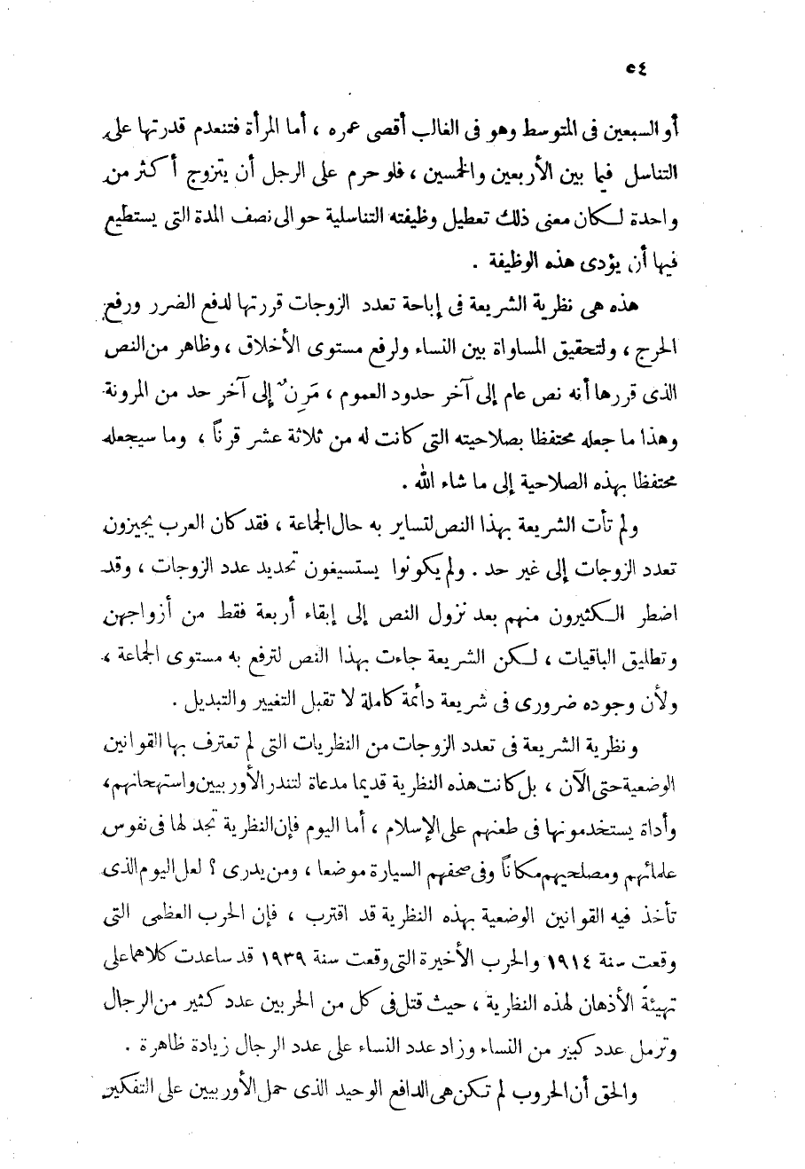 أو السبعين في المتوسط وهو في الغالب أقصى عمره، أما المرأة فتنعدم قدرتها على التناسل فيما بين الأربعين والخمسين، فلو حرم على الرجل أن يتزوج أكثر من واحدة لكان معنى ذلك تعطيل وظيفته التناسلية حوالي نصف المدة التي يستطيع فيها أن يؤدي هذه الوظيفة.