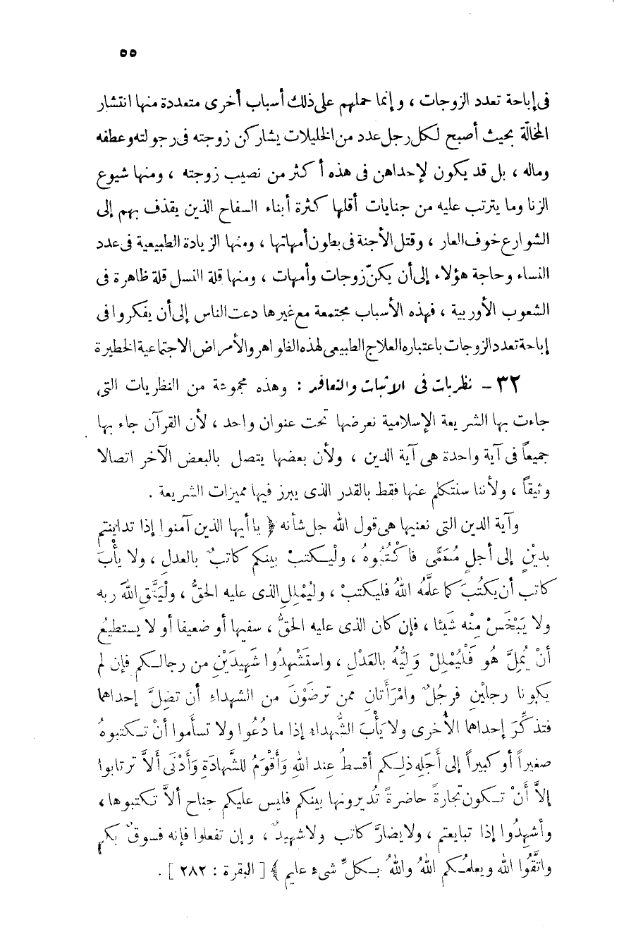 32 - نظريات في الإثبات والتعاقد: وهذه مجموعة من النظريات التي جاءت بها الشريعة الإسلامية نعرضها تحت عنوان واحد، لأن القرآن جاء بها جميعاً في آية واحدة هي آية الدين، ولأن بعضها يتصل بالبعض الآخر اتصالاً وثيقاً، ولأننا سنتكلم عنها فقط بالقدر الذي يبرز فيها مميزات الشريعة.