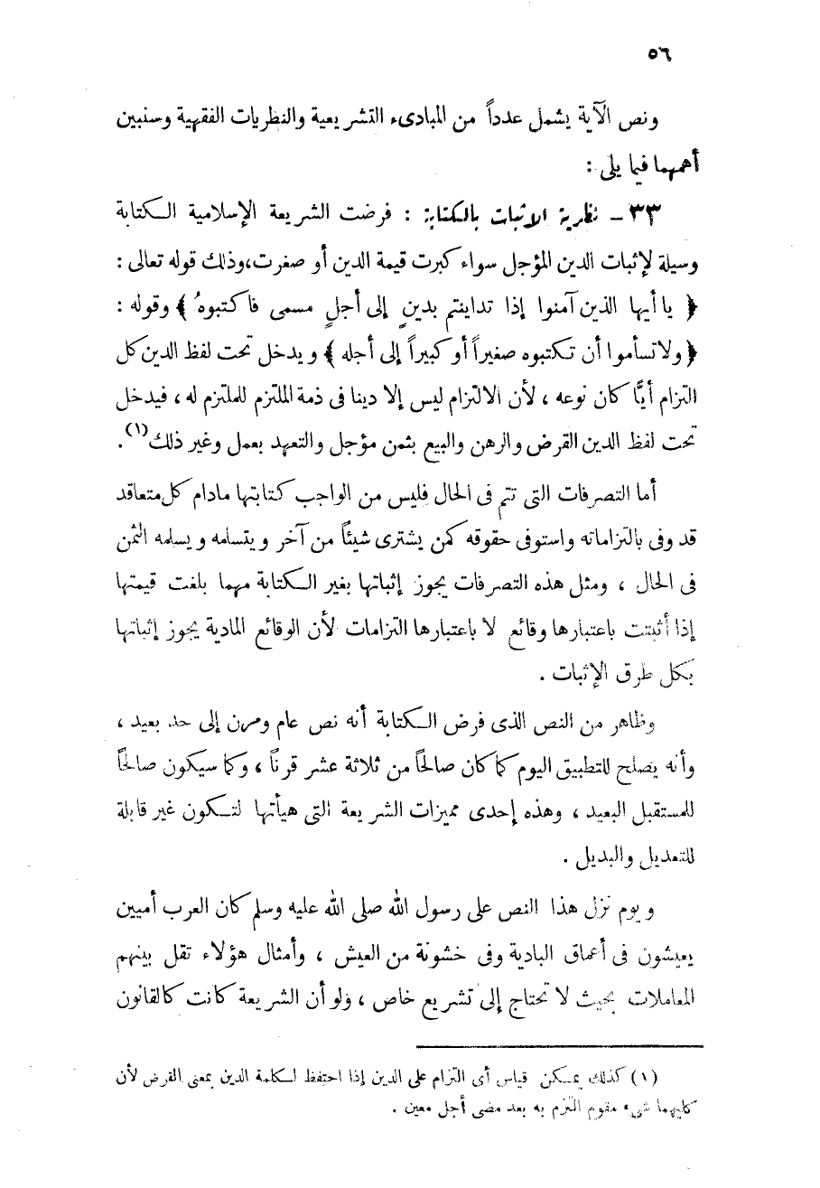 33 - نظرية الإثبات بالكتابة: فرضت الشريعة الإسلامية الكتابة وسيلة لإثبات الدين المؤجل سواء كبرت قيمة الدين أو صغرت، وذلك قوله تعالى: {يَا أَيُّهَا الَّذِينَ آمَنُواْ إِذَا تَدَايَنتُم بِدَيْنٍ إِلَى أَجَلٍ مُّسَمًّى فَاكْتُبُوهُ} ، وقوله: {وَلاَ تَسْأَمُوْاْ أَن تَكْتُبُوْهُ صَغِيرًا أَو كَبِيرًا إِلَى أَجَلِهِ} ، ويدخل تحت لفظ الدين كل التزام ايا كان نوعه، لأن الالتزام ليس إلا ديناً في ذمة الملتزم له، فيدخل تحت لفظ الدين القرض والرهن والبيع بثمن مؤجل والتعهد بعمل وغير ذلك (¬1) .