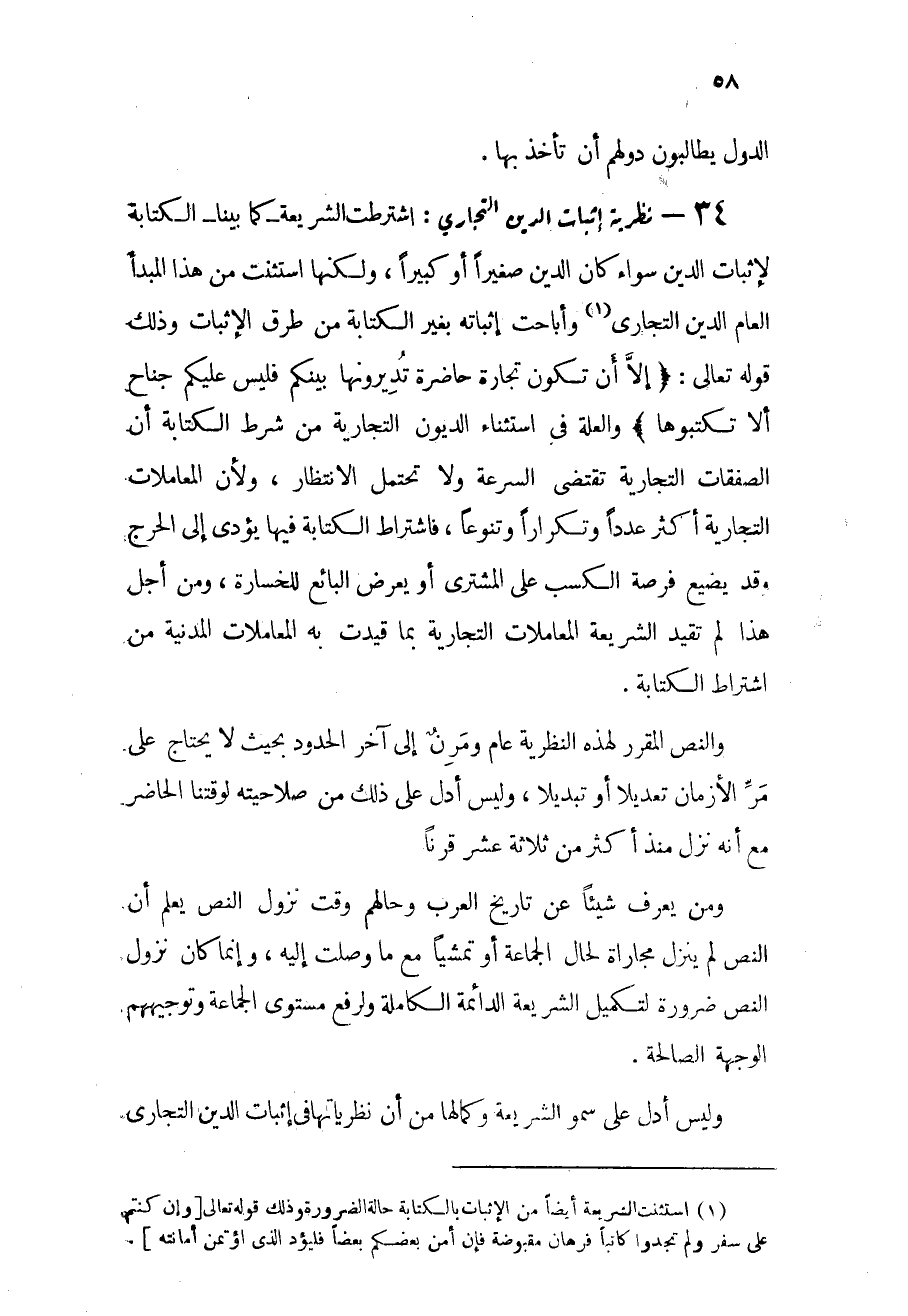 34 - نظرية إثبات الدين التجاري: اشترطت الشريعة - كما بينا - الكتابة لإثبات الدين سواء كان الدين صغيراً أو كبيراً، ولكنها استثنت من هذا المبدأ العام الدين التجاري (¬1) وأباحت إثباته بغير الكتابة من طرق الإثبات، وذلك قوله تعالى: {إِلاَّ أَن تَكُونَ تِجَارَةً حَاضِرَةً تُدِيرُونَهَا بَيْنَكُمْ فَلَيْسَ عَلَيْكُمْ جُنَاحٌ أَلاَّ تَكْتُبُوهَا} ، والعلة في استثناء الديون التجارية من شرط الكتابة أن الصفقات التجارية تقتضي السرعة ولا تحتمل الانتظار، ولأن المعاملات التجارية أكثر عدداً وتكراراً وتنوعاً، فاشتراط الكتابة فيها يؤدي إلى الحرج وقد يضيع فرصة الكسب على المشتري أو يعرض البائع للخسارة، ومن أجل هذا لم تقيد الشريعة المعاملات التجارية بما قيدت به المعاملات المدنية من اشتراط الكتابة.