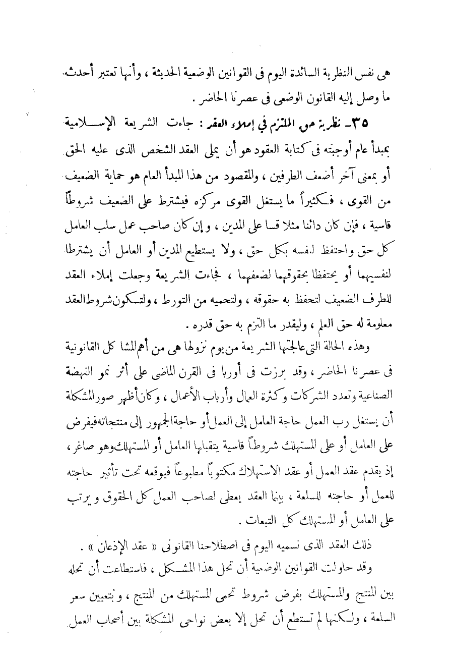 35 - نظرية حق الملتزم في إملاء العقد: جاءت الشريعة الإسلامية بمبدأ عام أوجبته في كتابة العقود هو أن يملي العقد الشخص الذي عليه الحق أو بمعنى آخر أضعف الطرفين، والمقصود من هذا المبدأ العام هو حماية الضعيف من القوي، فكثيراً ما يستغل القوي مركزه فيشترط على الضعيف شروطاً قاسية، فإن كان دائناً مثلاً قسا على المدين، وإن كان صاحب عمل سلب العامل كل حق واحتفظ لنفسه بكل حق، ولا يستطيع المدين أو العامل أن يشترطا لنفسيهما أو يحتفظا بحقوقهما لضعفهما، فجاءت الشريعة وجعلت إملاء العقد للطرف الضعيف لتحفظ به حقوقه، ولتحميه من التورط، ولتكون شروط العقد معلومة له حق العلم، وليقدر ما التزم به حق قدره.