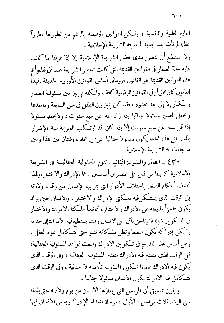 430 - الصغر والمسئولية الجنائية: تقوم المسئولية الجنائية في الشريعة الإسلامية كما بينا من قبل على عنصرين أساسيين، هما الإدراك والاختيار، ولهذا تختلف أحكام الصغار باختلاف الأدوار التي يمر بها الإنسان من وقت ولادته إلى الوقت الذي يستكمل فيه ملكتي الإدراك والاختيار. والإنسان حين يولد يكون عاجزاً بطبيعته عن الإدراك والاختيار، ثم تبدأ ملكتا الإدراك والاختيار، ثم تبدأ ملكتا الإدراك والاختيار في التكوين شيئاً فشيئاً حتى يأتي على الإنسان وقت يستطيع فيهالإدراك إلى حد ما ولكن إدراكه يكون ضعيفاً وتظل ملكاته تنمو حتى يتكامل نموه العقلي.