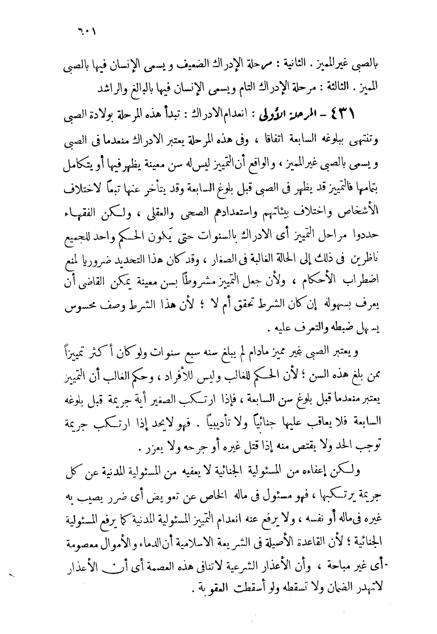431 - المرحلة الأولى: انعدام الإدراك: تبدأ هذه المرحلة بولادة الصبي وتنتهي ببلوغه السابعة اتفاقاً، وفي هذه المرحلة يعتبر الإدراك منعدماً في الصبى ويسمى بالصبي غير المميز، والواقع أن التمييز ليس له سن معينة يظهر أو يتكامل بتمامها، فالتمييز قد يظهر في الصبى قبل بلوغ السابعة وقد يتأخر عنها تبعاً لاختلاف الأشخاص واختلاف بيئاتهم واستعدادهم الصحي والعقلي، ولكن الفقهاء حددوا مراحل التمييز أي الإدراك بالسنوات حتى يكون الحكم واحداً للجميع ناظرين في ذلك إلى الحالة الغالبة في الصغار، وقد كان هذا التحديد ضرورياً لمنع اضطراب الأحكام، ولأن جعل التمييز مشروطاً بسن معينة يمكن القاضي أن يعرف بسهولة إن كان الشرط تحقق أم لا؛ لأن هذا الشرط وصف محسوس يسهل ضبطه والتعرف عليه.