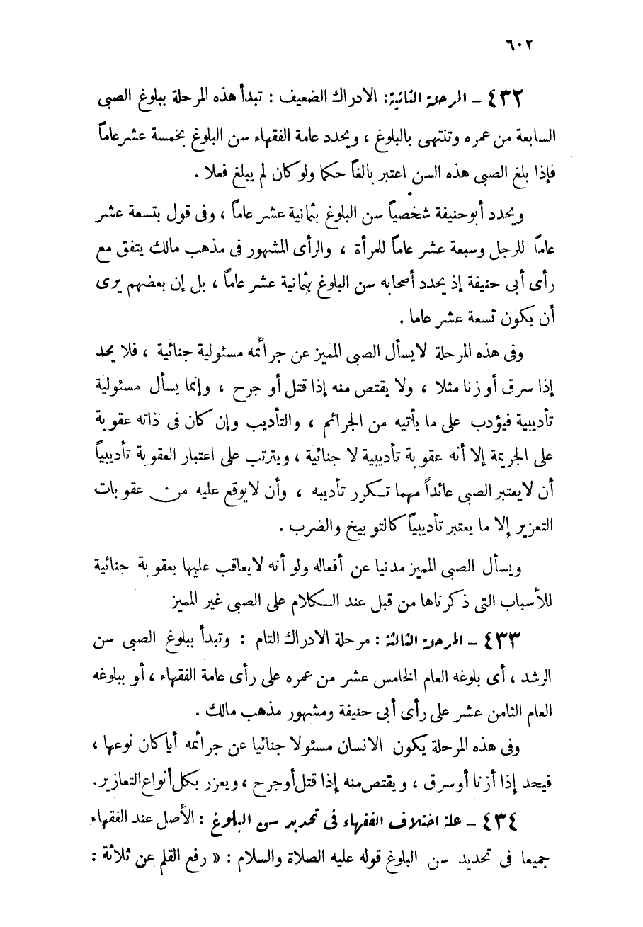 432 - المرحلة الثانية: الإدراك الضعيف: تبدأ هذه المرحلة ببلوغ الصبي السابعة من عمره وتنتهي بالبلوغ، ويحدد عامة الفقهاء سن البلوغ بخمسة عشر عاماً، فإذا بلغ الصبي هذه السن اعتبر بالغاً حكماً ولو كان لم يبلغ فعلاً.