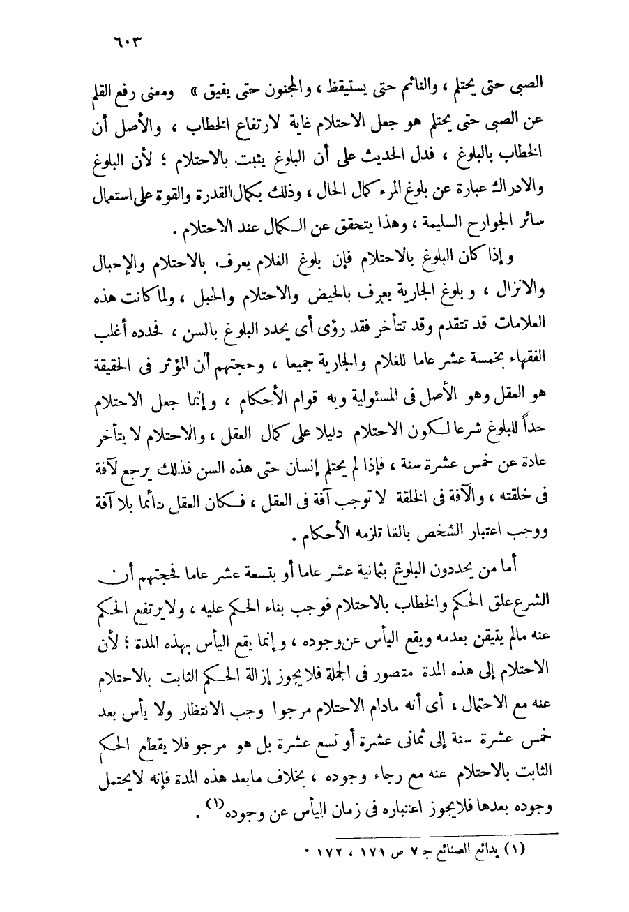 أما من يحددون البلوغ بثمانية عشر عاماً أو بتسعة عشر عاماً فحجتهم أن الشرع علق الحكم والخطاب والاحتلام فوجب بناء الحكم عليه، ولا يرتفع الحكم عنه ما لم يتيقن بعدمه ويقع اليأس عن وجوده، وإنما يقع اليأس بهذه المدة؛ لأن الاحتلام إلى هذه المدة متصور في الجملة فلا يجوز إزالة الحكم الثابت بالاحتلام عنه مع الاحتمال، أي أنه ما دام الاحتلام مرجواً وجب الانتظار ولا بأس بعد خمس عشرة سنة إلى ثماني عشرة أو تسع عشرة بل هو مرجو فلا يقطع الحكم الثابت بالاحتلام عنه مع رجاء وجوده، بخلاف ما بعد هذه المدة فإنه لا يحتمل وجوده بعدها فلا يجوز اعتباره في زمان اليأس عن وجوده (¬1) .