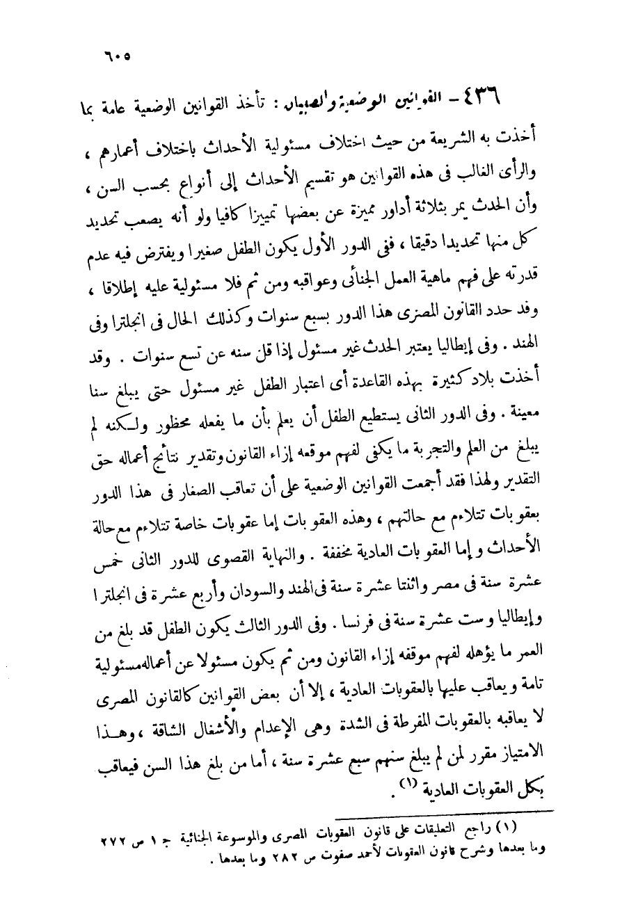 436 - والقوانين الوضعية والصبيان: تأخذ القوانين الوضعية عامة بما تأخذ به الشريعة من حيث اختلاف مسئولية الأحداث باختلاف أعمارهم، والرأي الغالب في هذه القوانين إلى تقسيم الأحداث إلى أنواع بحسب السن، وأن الحدث يمر بثلاثة أدوار مميزة عن بعضها تمييزاً كافياً ولو أنه يصعب تحديد كل منها تحديداً دقيقاً.