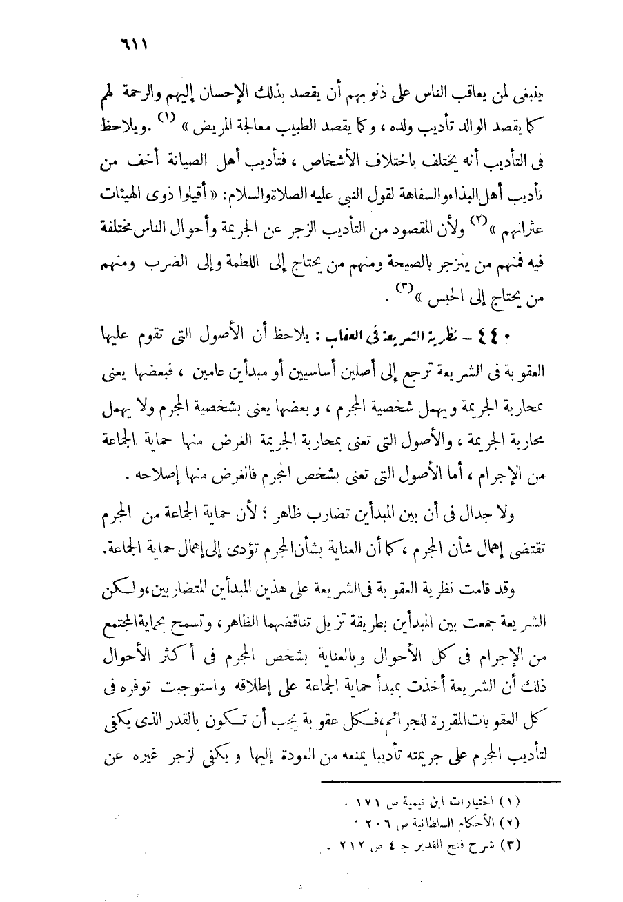 440 - نظرية الشريعة في العقاب: يلاحظ أن الأصول التي تقوم عليها العقوبة في الشريعة ترجع إلى أصلين أساسيين أو مبدأين عامين، فبعضها يعني بمحاربة الجريمة ويهمل شخصية المجرم وبعضها يعني بشخصية المجرم ولا يهمل محاربة الجريمة. والأصول التي تعني بمحاربة الجريمة الغرض منها حماية الجماعة من الإجرام، أما الأصول التي تعني بشخص المجرم فالغرض منها إصلاحه.