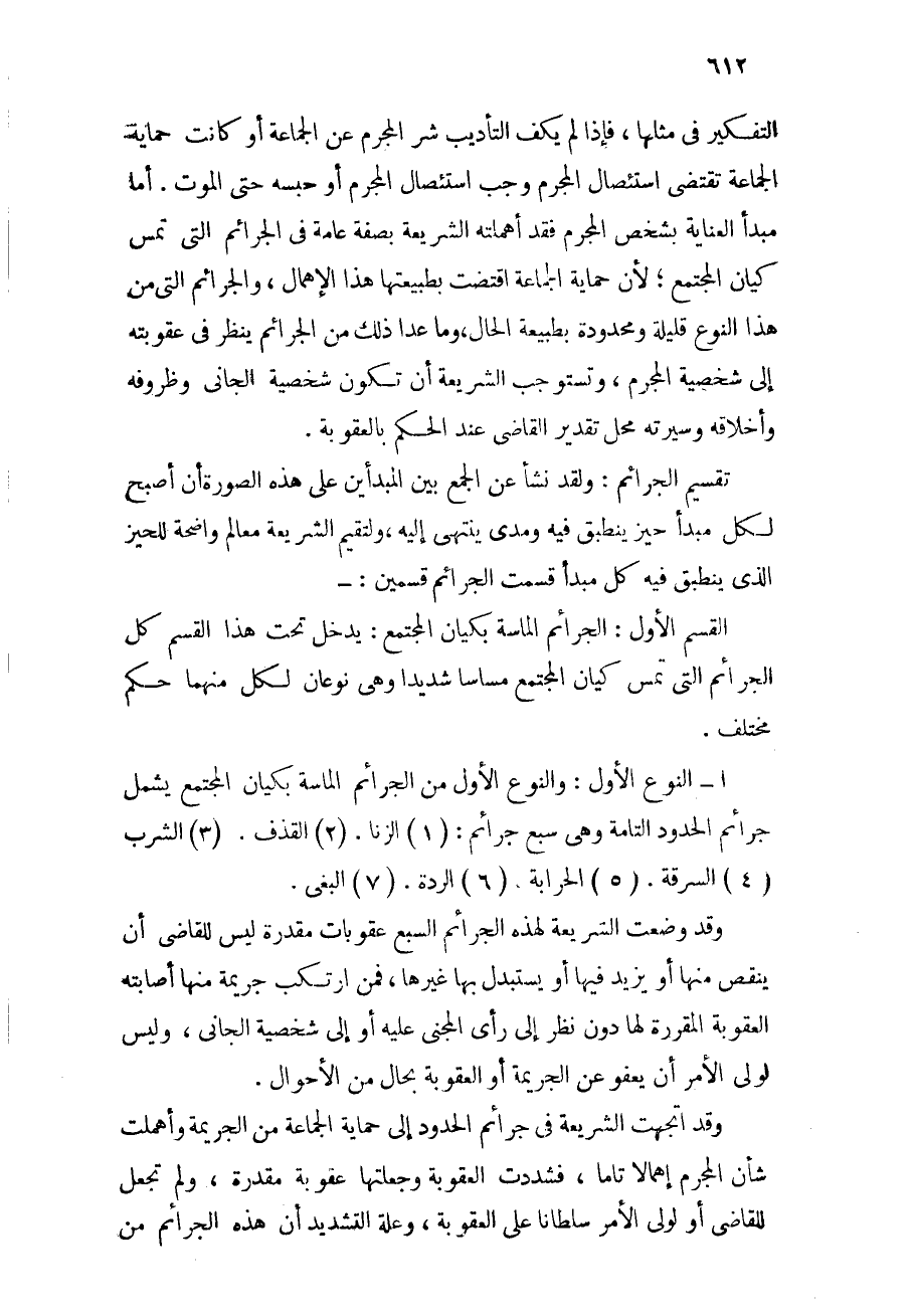 القسم الأول: الجرائم الماسة بكيان المجتمع: يدخل تحت هذا القسم كل القسم كل الجرائم التي تمس كيان المجتمع مساساً شديداً، وهي نوعان لكل منهما حكم مختلف.
