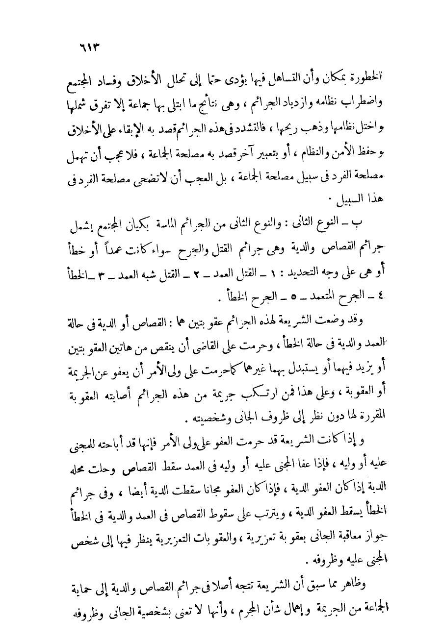 ب - النوع الثاني: والنوع الثاني من الجرائم الماسة بكيان المجتمع يشمل جرائم القصاص والدية؛ وهي جرائم القتل والجرح سواء كانت عمداً أو خطأً، أو هي على وجه التحديد: