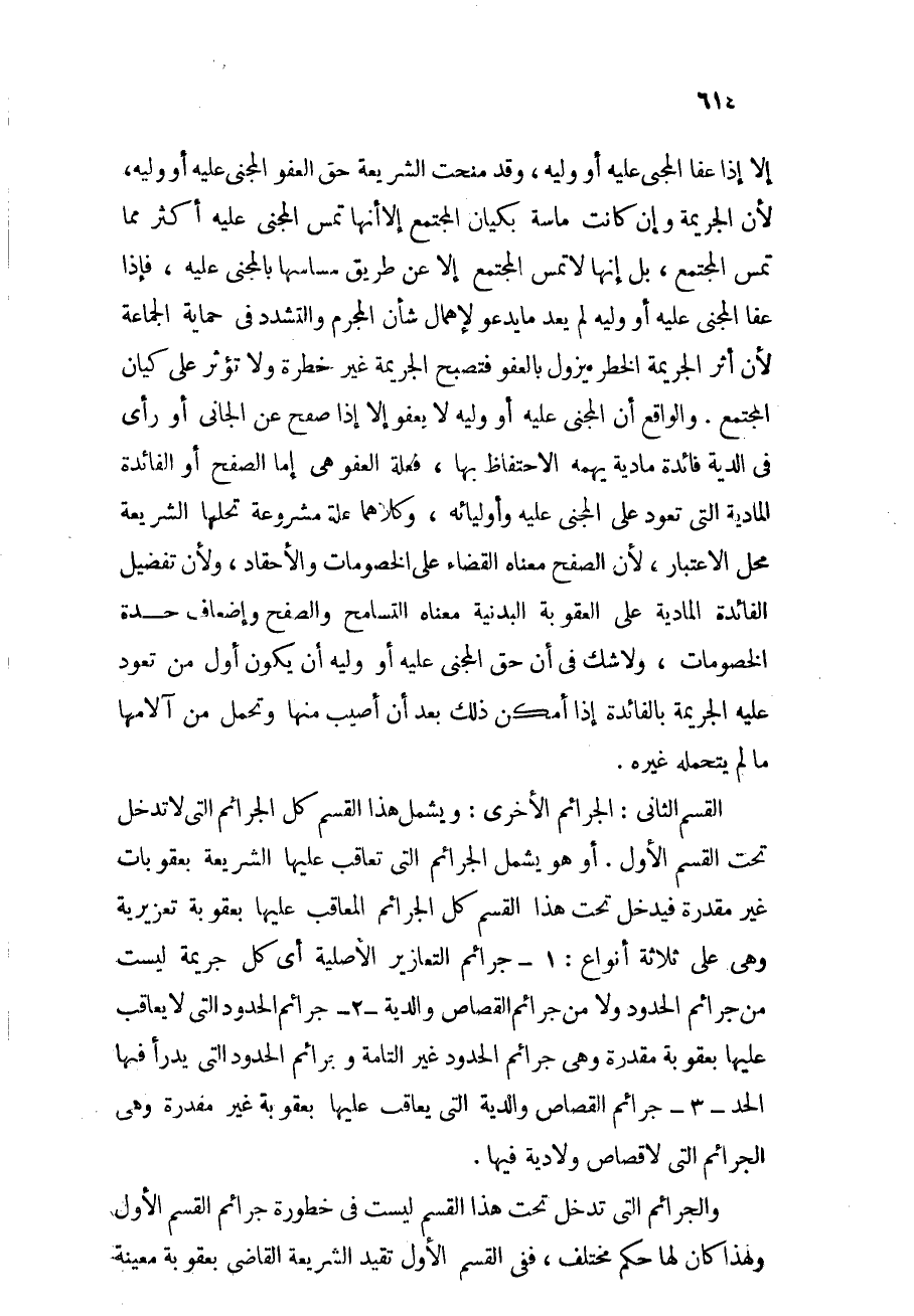إلا إذا عفا المجني عليه أو وليه، وقد منحت الشريعة حق العفو للمجني عليه أو وليه، لأن الجريمة وإن كانت ماسة بكيان المجتمع إلا أنها تمس المجني عليه أكثر مما تمس المجتمع، بل إنها لا تمس المجتمع إلا عن طريق مساسها بالمجني عليه، فإذا عفا المجني عليه أو وليه لم يعد ما يدعو لإهمال شأن المجرم والتشدد في حماية الجماعة؛ لأن أثر الجيمة الخطر يزول بالعفو فتصبح الجريمة غير خطرة ولا تؤثر على كيان المجتمع.